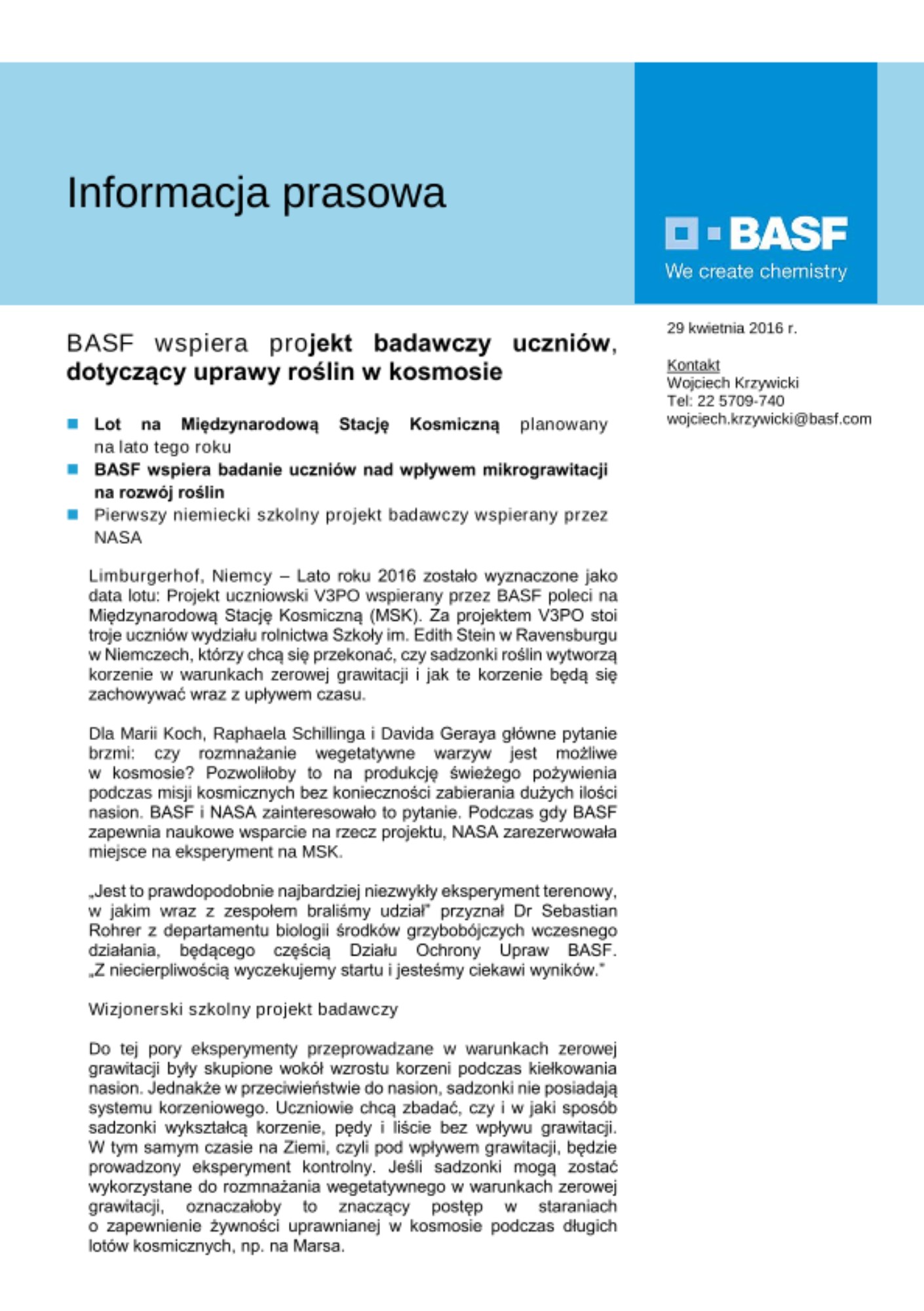 Limburgerhof, Niemcy – Lato roku 2016 zostało wyznaczone jako data lotu: Projekt uczniowski V3PO wspierany przez BASF poleci na Międzynarodową Stację Kosmiczną (MSK). Za projektem V3PO stoi troje uczniów wydziału rolnictwa Szkoły im. Edith Stein w Ravensburgu w Niemczech, którzy chcą się przekonać, czy sadzonki roślin wytworzą korzenie w warunkach zerowej grawitacji i jak te korzenie będą się zachowywać wraz z upływem czasu.