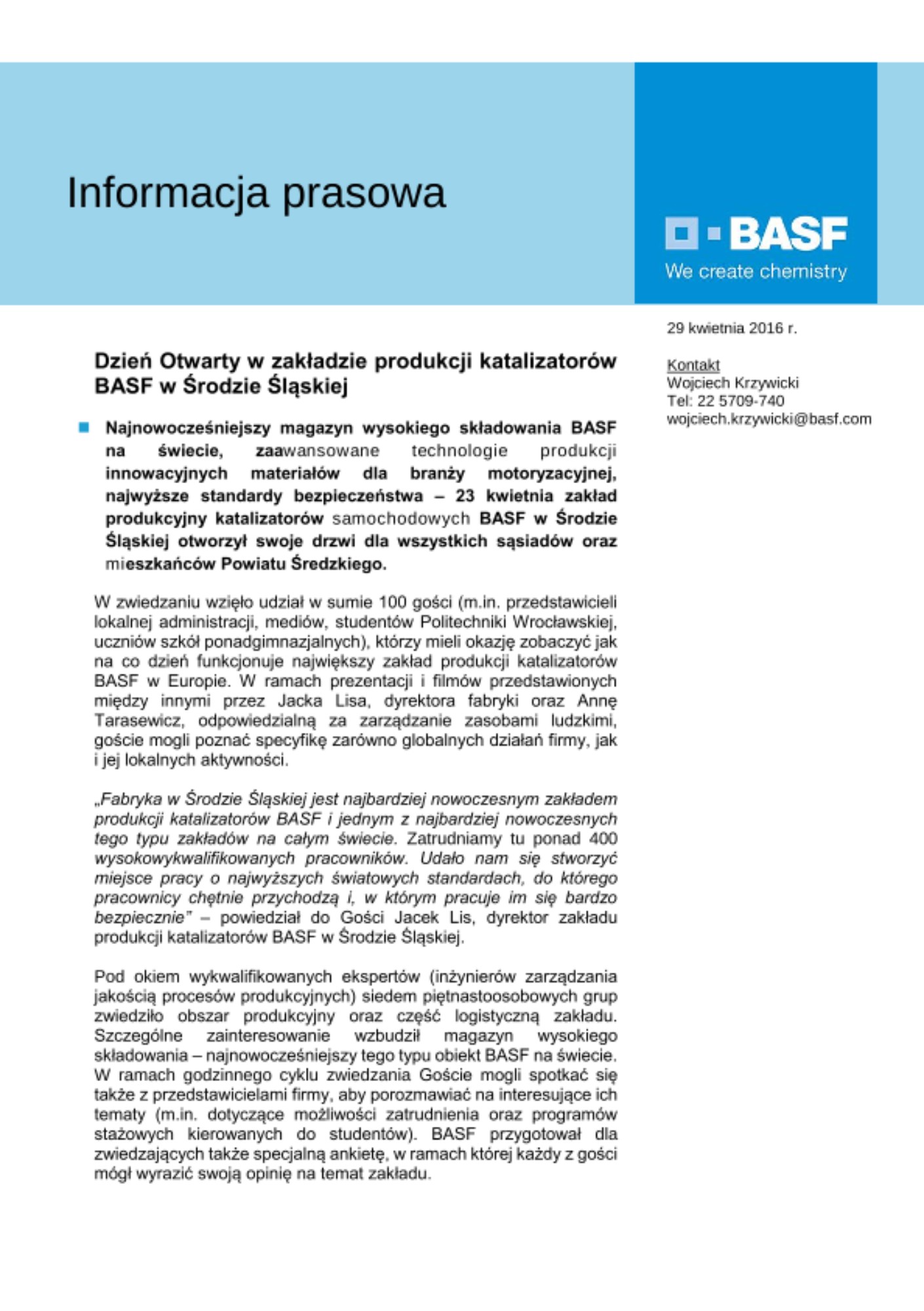Poprzez uruchomienie zakładu produkcji katalizatorów samochodowych w Środzie Śląskiej w 2014 roku, firma BASF trwale zaznaczyła swoją obecność w powiecie średzkim i województwie dolnośląskim. Wytwarzane tam katalizatory samochodowe są dostarczane producentom aut w całej Europie. We wrześniu 2015 roku ich produkcja przekroczyła pierwszy milion. Poprzez działalność biznesową i aktywności kierowane do społeczności lokalnej, firma promuje innowacje oraz zrównoważony rozwój, a także wspiera edukację chemiczną. Jesteśmy dumni ze współpracy z uznanymi Partnerami w regionie Dolnego Śląska. W ubiegłym roku wspólnie świętowaliśmy 150-lecie firmy BASF na terenie Wrocławskiego Centrum Badań EIT+. W tamtejszym Humanitarium we wrześniu 2015 otworzyliśmy laboratorium chemiczne dla dzieci i młodzieży, które odwiedziło już ponad 10 tys. uczniów z Dolnego Śląska (w maju br. uruchomimy tam drugie, analogiczne laboratorium). Wspólnie z mieszkańcami Środy Śląskiej włączamy się w tradycyjne obchody „Święta Wina w Mieście Skarbów”. Zrealizowaliśmy także edukacyjny program ekologiczny „Ekoedukacja”, w którym wzięło udział aż 700 uczniów ze wszystkich szkół podstawowych w Środzie Śląskiej.