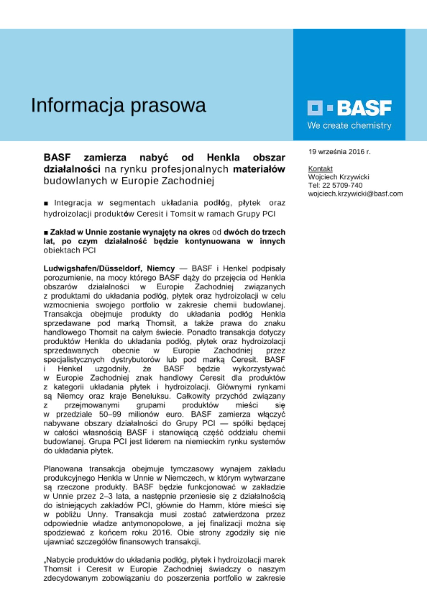 Ludwigshafen/Düsseldorf, Niemcy — BASF i Henkel podpisały porozumienie, na mocy którego BASF dąży do przejęcia od Henkla obszarów działalności w Europie Zachodniej związanych z produktami do układania podłóg, płytek oraz hydroizolacji w celu wzmocnienia swojego portfolio w zakresie chemii budowlanej. Transakcja obejmuje produkty do układania podłóg Henkla sprzedawane pod marką Thomsit, a także prawa do znaku handlowego Thomsit na całym świecie. Ponadto transakcja dotyczy produktów Henkla do układania podłóg, płytek oraz hydroizolacji sprzedawanych obecnie w Europie Zachodniej przez specjalistycznych dystrybutorów lub pod marką Ceresit. BASF i Henkel uzgodniły, że BASF będzie wykorzystywać w Europie Zachodniej znak handlowy Ceresit dla produktów z kategorii układania płytek i hydroizolacji. Głównymi rynkami są Niemcy oraz kraje Beneluksu. Całkowity przychód związany z przejmowanymi grupami produktów mieści się w przedziale 50–99 milionów euro. BASF zamierza włączyć nabywane obszary działalności do Grupy PCI — spółki będącej w całości własnością BASF i stanowiącą część oddziału chemii budowlanej. Grupa PCI jest liderem na niemieckim rynku systemów do układania płytek.