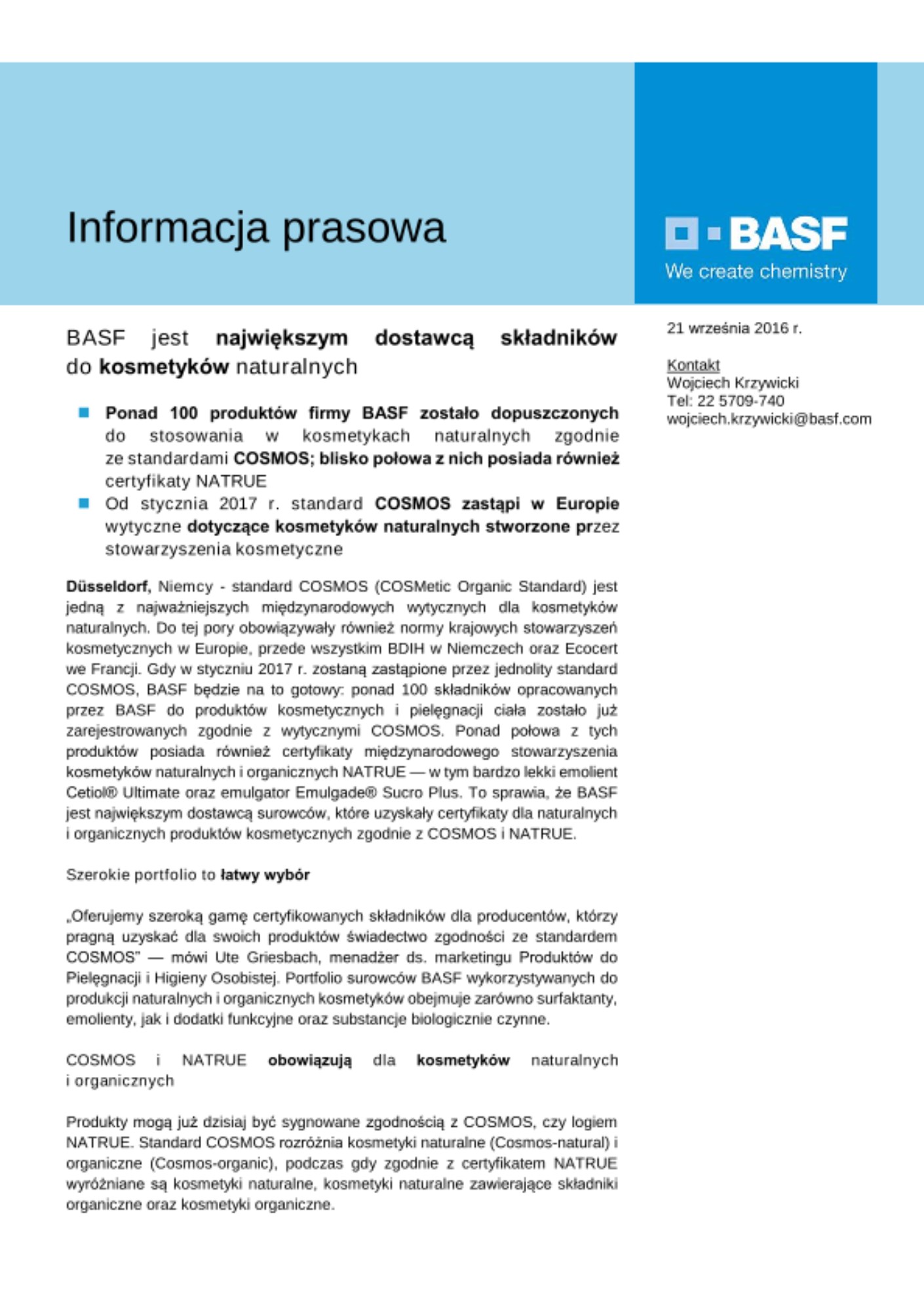 - Ponad 100 produktów firmy BASF zostało dopuszczonych do stosowania w kosmetykach naturalnych zgodnie ze standardami COSMOS; blisko połowa z nich posiada również certyfikaty NATRUE
