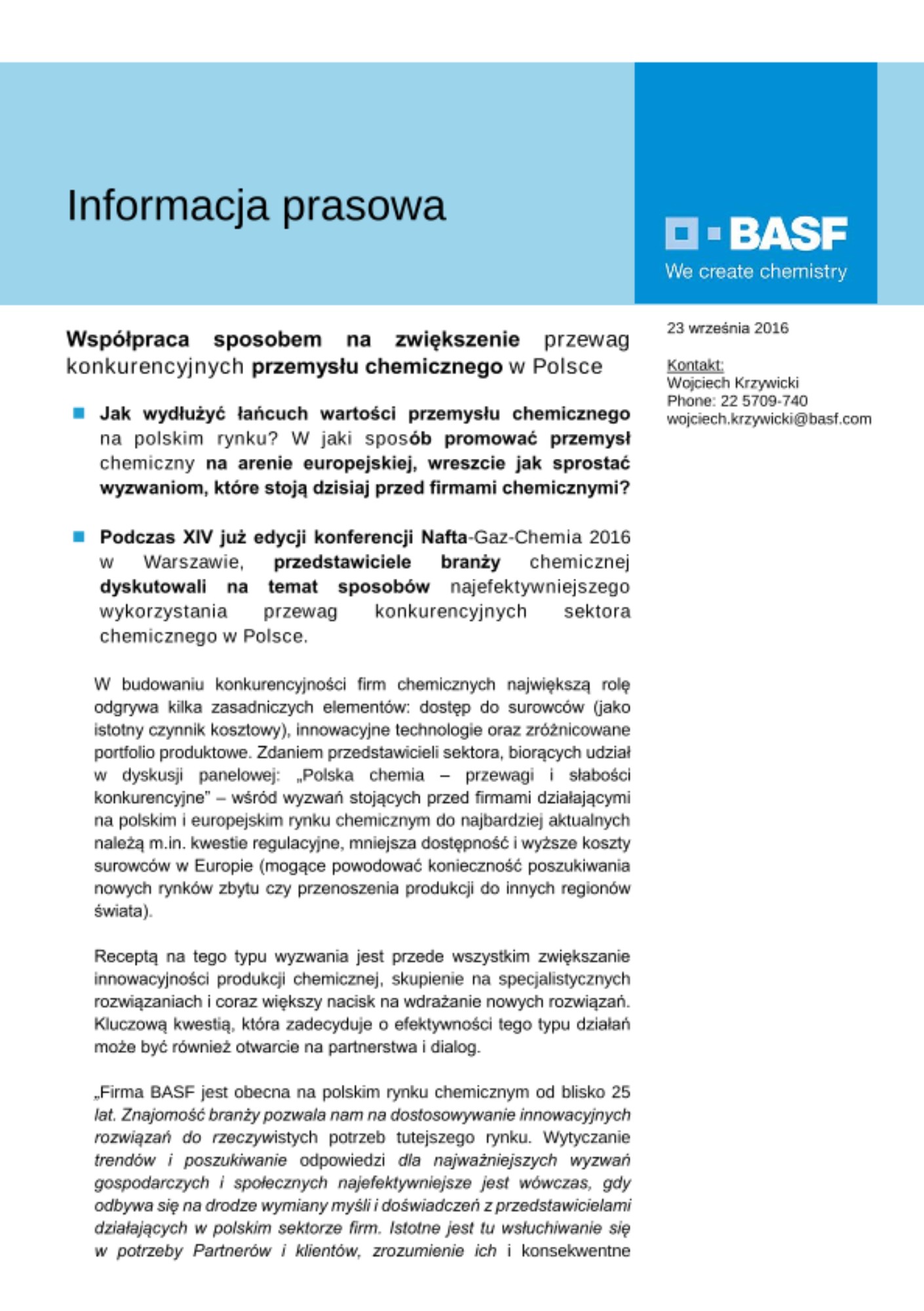 „Firma BASF jest obecna na polskim rynku chemicznym od blisko 25 lat. Znajomość branży pozwala nam na dostosowywanie innowacyjnych rozwiązań do rzeczywistych potrzeb tutejszego rynku. Wytyczanie trendów i poszukiwanie odpowiedzi dla najważniejszych wyzwań gospodarczych i społecznych najefektywniejsze jest wówczas, gdy odbywa się na drodze wymiany myśli i doświadczeń z przedstawicielami działających w polskim sektorze firm. Istotne jest tu wsłuchiwanie się w potrzeby Partnerów i klientów, zrozumienie ich i konsekwentne dążenie do realizacji wspólnych celów. Otwartość, zaufanie i połączenie potencjałów badawczych jest istotą innowacyjności” – powiedział Marek Jagieła, dyrektor działu chemii przemysłowej i działu rozwoju rynku w BASF Polska, który wziął udział w debacie „Polska chemia – przewagi i słabości konkurencyjne”.