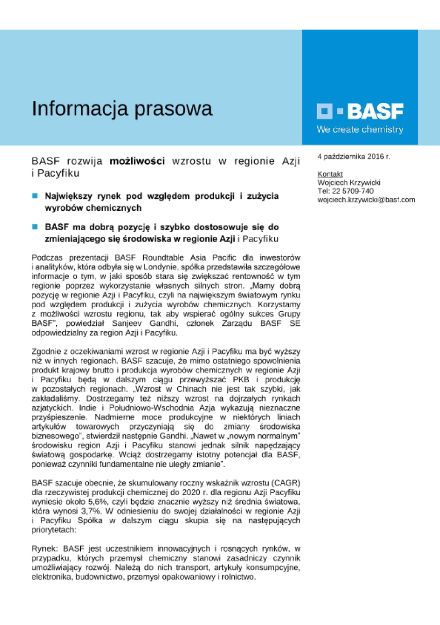 Podczas prezentacji BASF Roundtable Asia Pacific dla inwestorów i analityków, która odbyła się w Londynie, spółka przedstawiła szczegółowe informacje o tym, w jaki sposób stara się zwiększać rentowność w tym regionie poprzez wykorzystanie własnych silnych stron. „Mamy dobrą pozycję w regionie Azji i Pacyfiku, czyli na największym światowym rynku pod względem produkcji i zużycia wyrobów chemicznych. Korzystamy z możliwości wzrostu regionu, tak aby wspierać ogólny sukces Grupy BASF”, powiedział Sanjeev Gandhi, członek Zarządu BASF SE odpowiedzialny za region Azji i Pacyfiku.