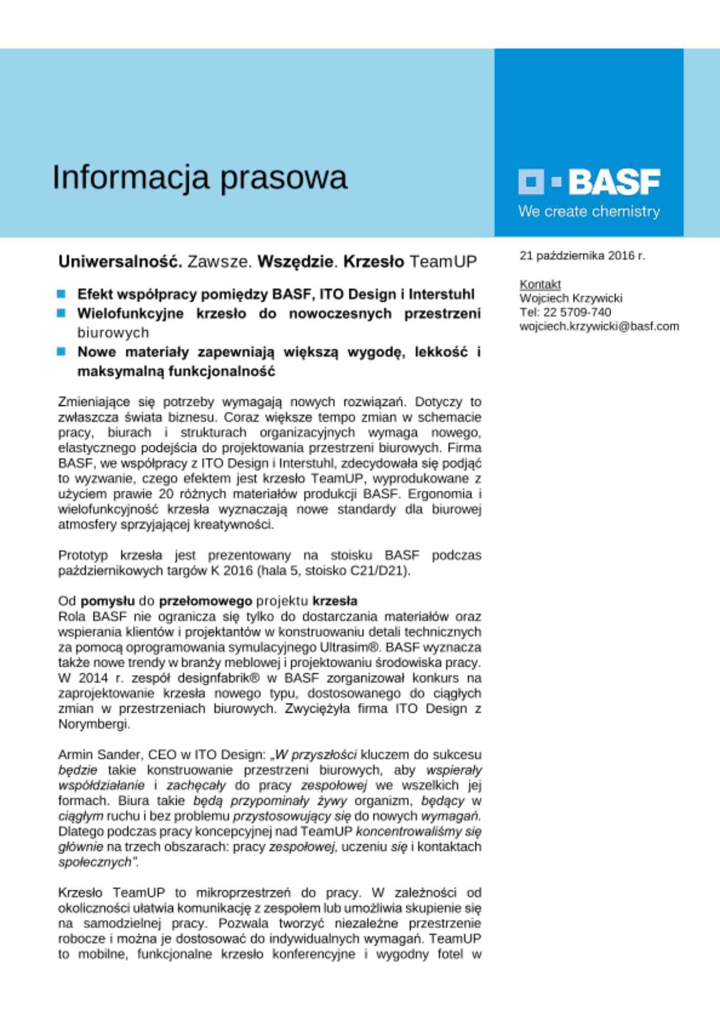 Krzesło TeamUP jest prezentowane przez BASF na targach K 2016. Dodatkowo produkt będzie można zobaczyć podczas międzynarodowych targów wyposażenia nowoczesnych biur - Orgatec, na stoisku Interstuhl B058-C059 w hali nr 7.1. Targi Orgatec odbędą się w Kolonii w dniach 25–29 października 2016 r.