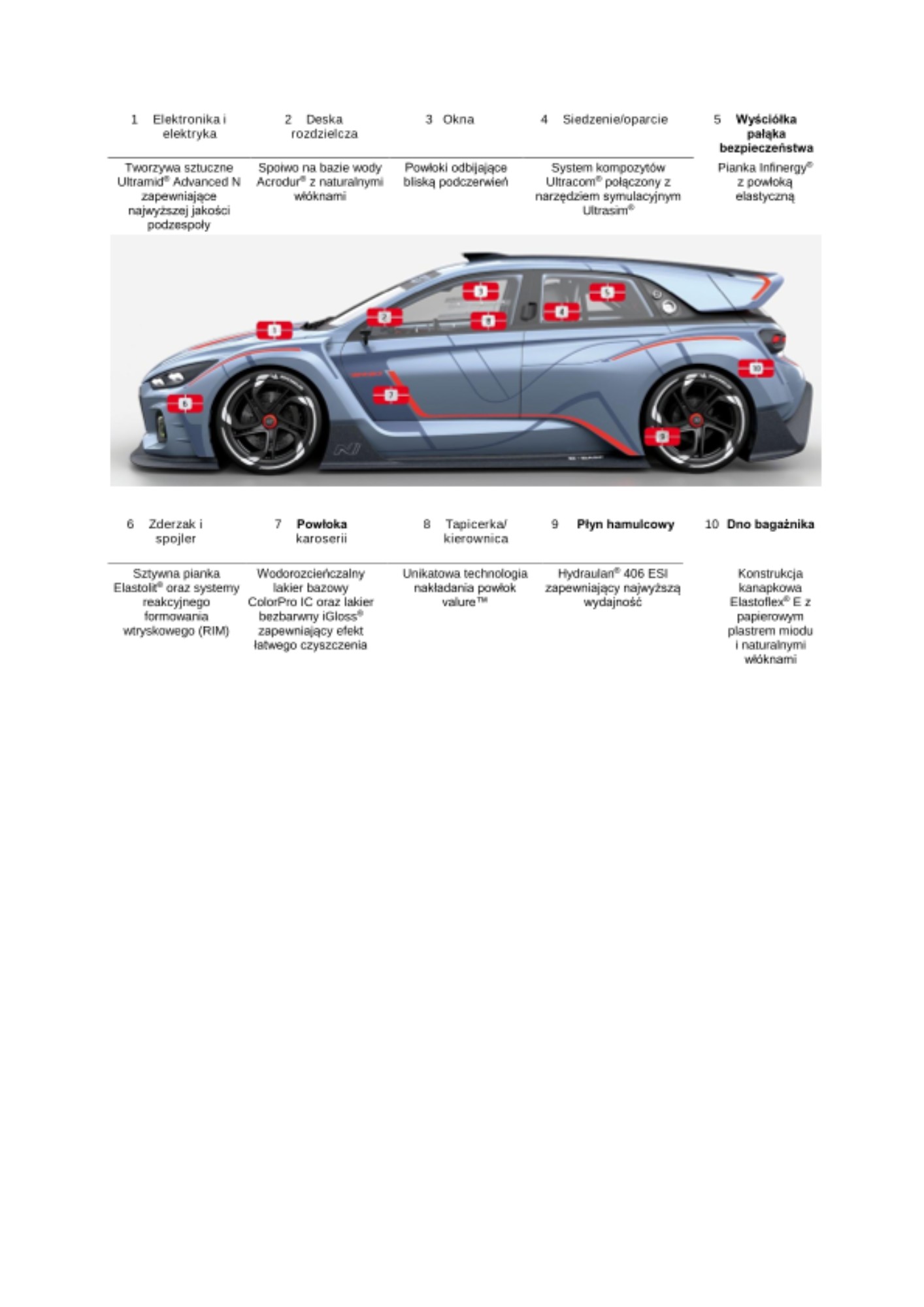 „Jesteśmy bardzo dumni, że stanowimy istotną część RN30”, powiedział Raimar Jahn, President of Performance Materials w BASF. „Dzięki wyjątkowej współpracy oraz możliwościom w zakresie innowacji, Hyundai Motor zaprosił nas do wykazania potencjału naszych materiałów w ramach tego wyjątkowego pomysłu.” Nowy samochód koncepcyjny został stworzony z myślą o czystej przyjemności z jazdy na torze wyścigowym. Dzięki imponującemu portfolio produktów firmy oraz pasji do samochodów rozwiązania materiałowe BASF pomogły firmie Hyundai zrealizować nawet najbardziej śmiałe pomysły