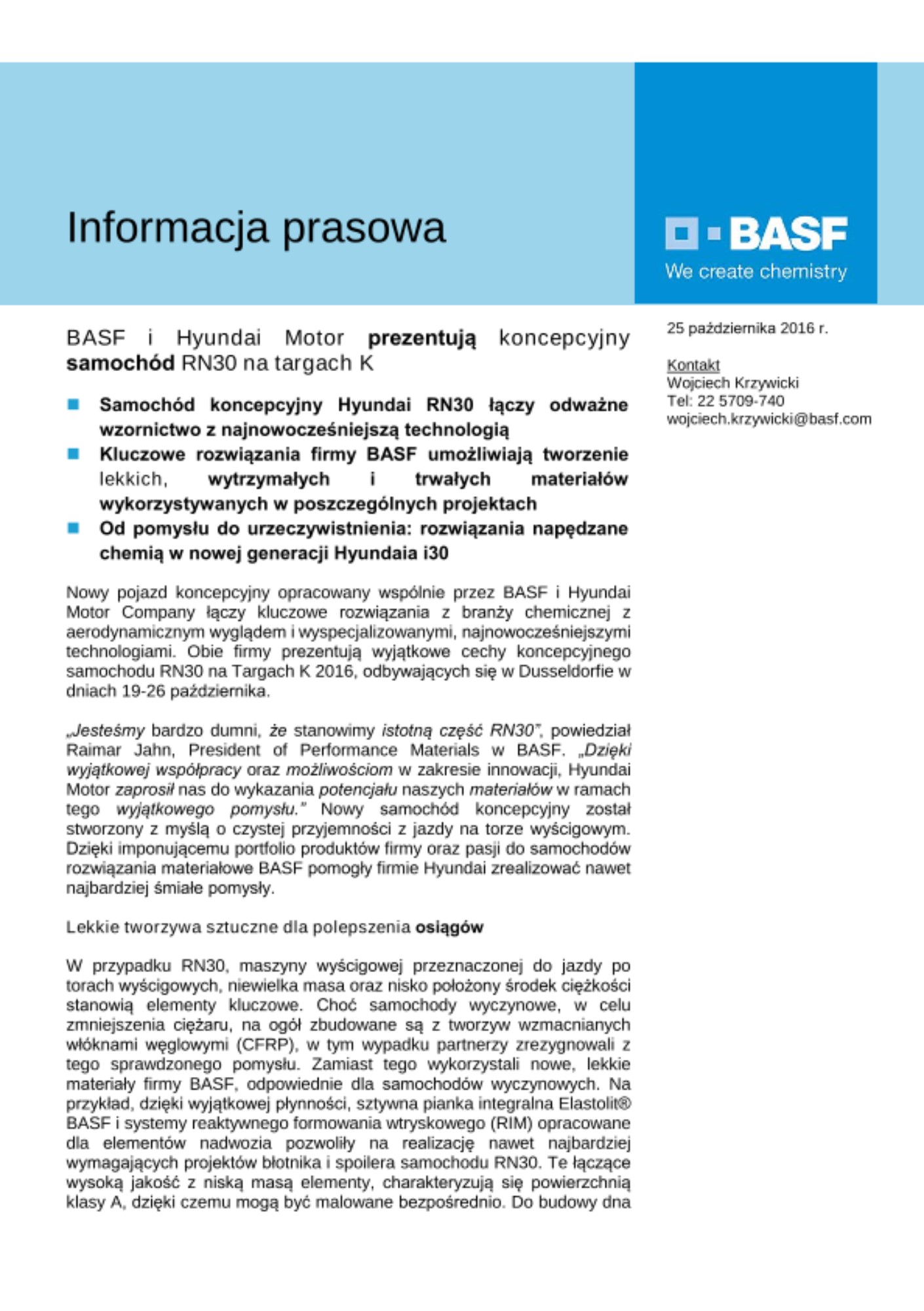 Nowy pojazd koncepcyjny opracowany wspólnie przez BASF i Hyundai Motor Company łączy kluczowe rozwiązania z branży chemicznej z aerodynamicznym wyglądem i wyspecjalizowanymi, najnowocześniejszymi technologiami. Obie firmy prezentują wyjątkowe cechy koncepcyjnego samochodu RN30 na Targach K 2016, odbywających się w Dusseldorfie w dniach 19-26 października.