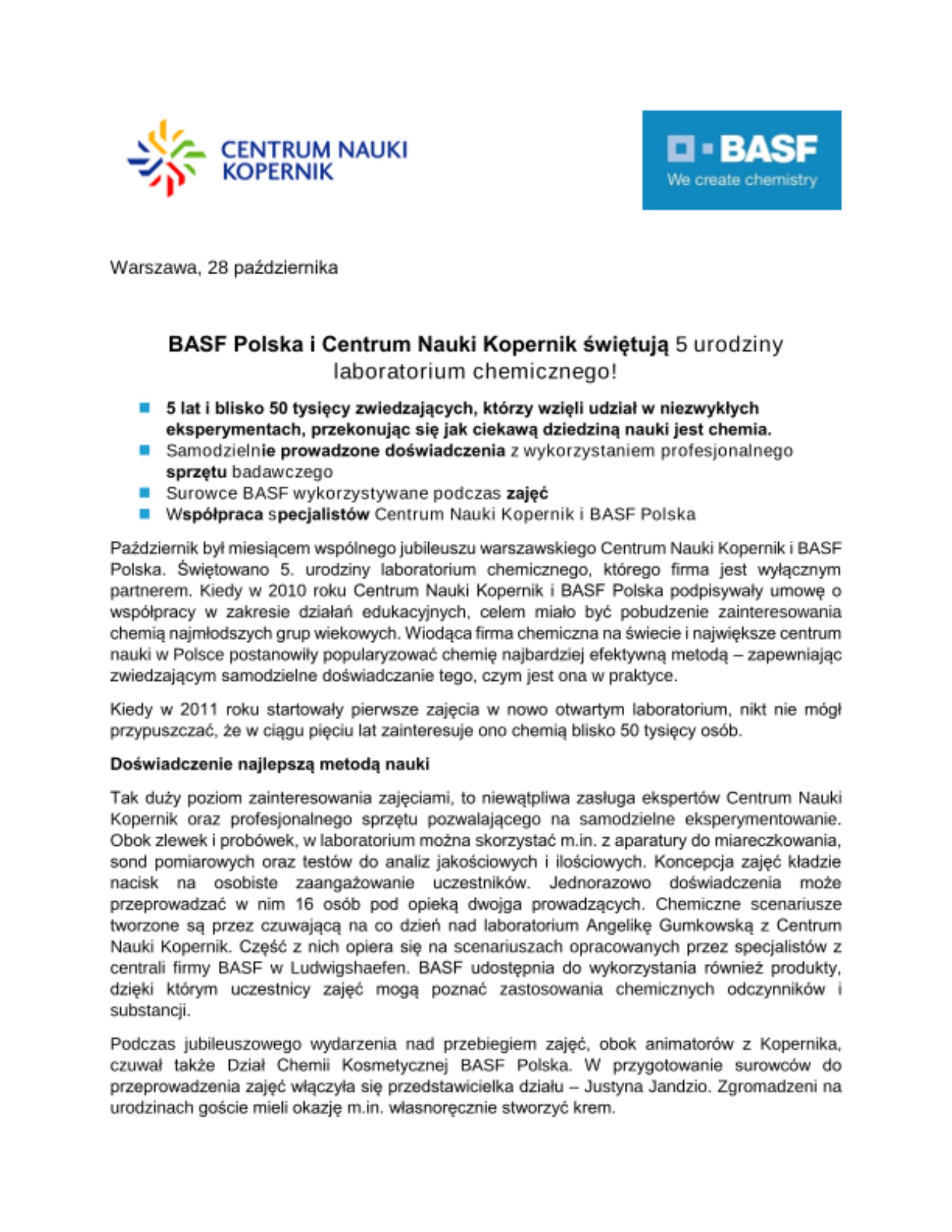 Październik był miesiącem wspólnego jubileuszu warszawskiego Centrum Nauki Kopernik i BASF Polska. Świętowano 5. urodziny laboratorium chemicznego, którego firma jest wyłącznym partnerem. Kiedy w 2010 roku Centrum Nauki Kopernik i BASF Polska podpisywały umowę o współpracy w zakresie działań edukacyjnych, celem miało być pobudzenie zainteresowania chemią najmłodszych grup wiekowych. Wiodąca firma chemiczna na świecie i największe centrum nauki w Polsce postanowiły popularyzować chemię najbardziej efektywną metodą – zapewniając zwiedzającym samodzielne doświadczanie tego, czym jest ona w praktyce.