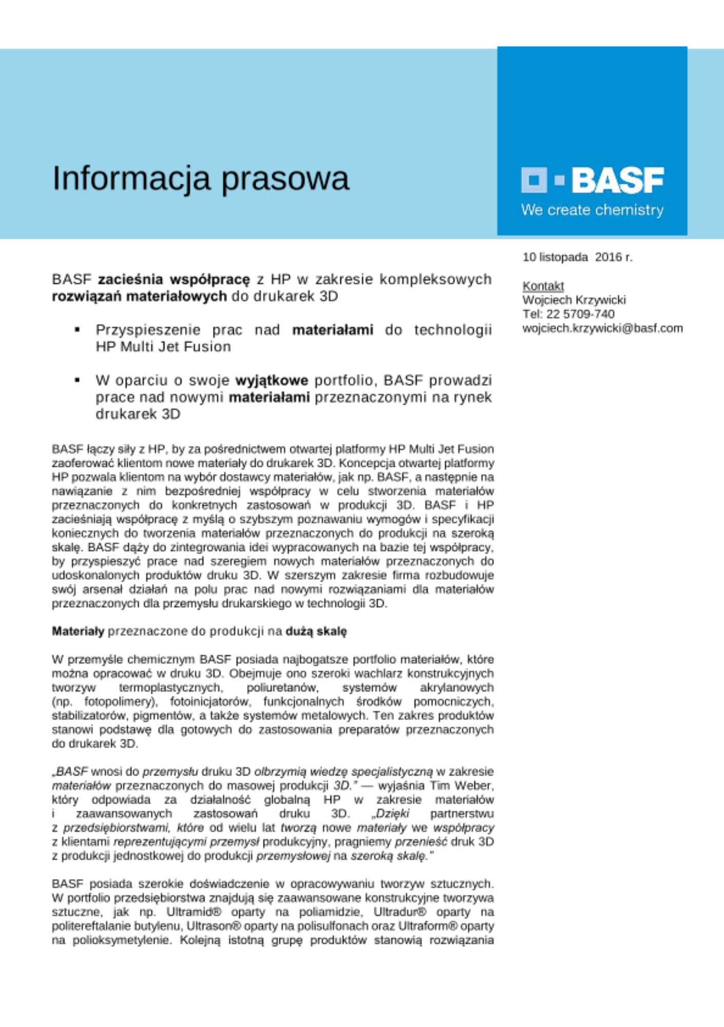 BASF łączy siły z HP, by za pośrednictwem otwartej platformy HP Multi Jet Fusion zaoferować klientom nowe materiały do drukarek 3D. Koncepcja otwartej platformy HP pozwala klientom na wybór dostawcy materiałów, jak np. BASF, a następnie na nawiązanie z nim bezpośredniej współpracy w celu stworzenia materiałów przeznaczonych do konkretnych zastosowań w produkcji 3D. BASF i HP zacieśniają współpracę z myślą o szybszym poznawaniu wymogów i specyfikacji koniecznych do tworzenia materiałów przeznaczonych do produkcji na szeroką skalę. BASF dąży do zintegrowania idei wypracowanych na bazie tej współpracy, by przyspieszyć prace nad szeregiem nowych materiałów przeznaczonych do udoskonalonych produktów druku 3D. W szerszym zakresie firma rozbudowuje swój arsenał działań na polu prac nad nowymi rozwiązaniami dla materiałów przeznaczonych dla przemysłu drukarskiego w technologii 3D.