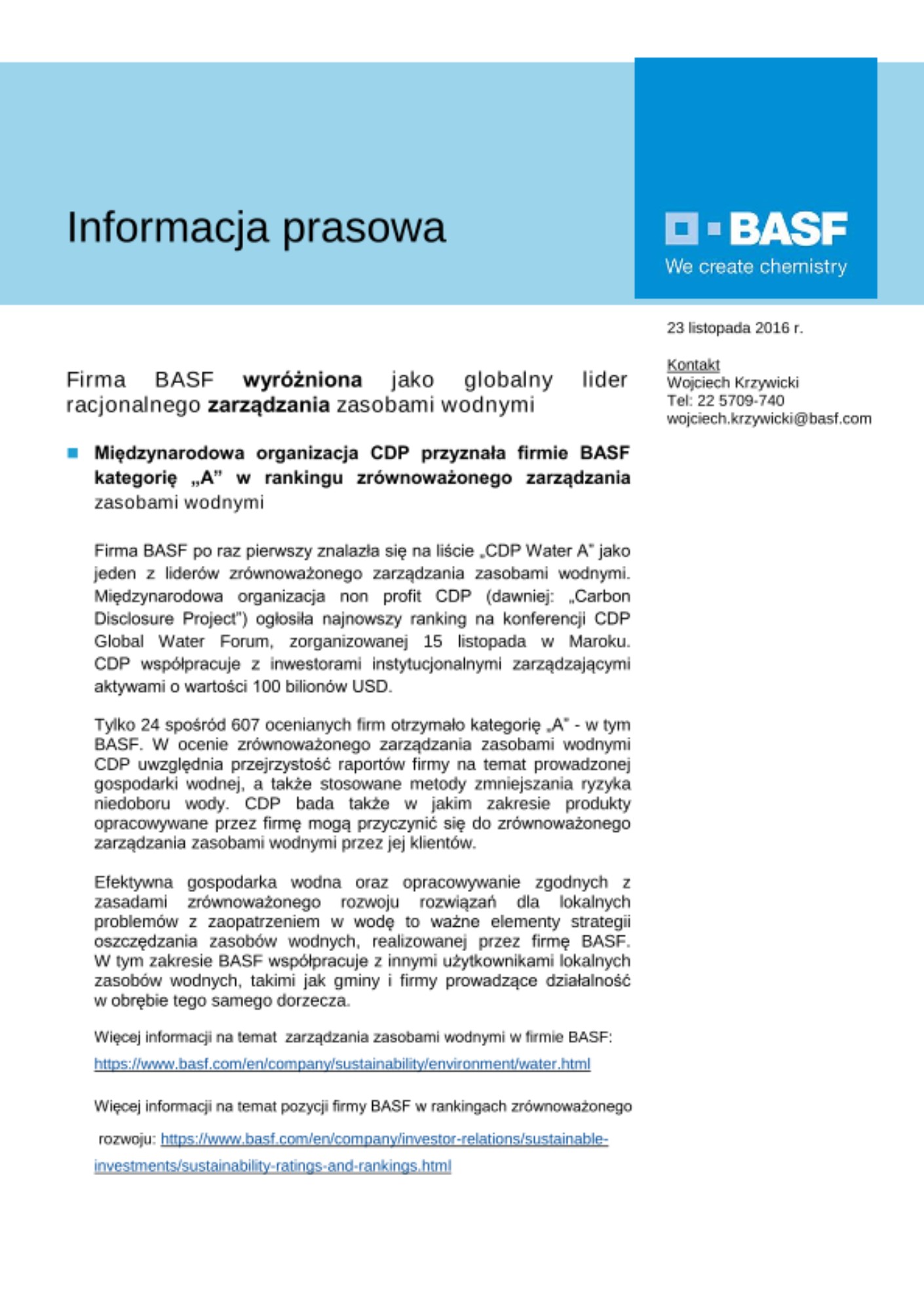 Tylko 24 spośród 607 ocenianych firm otrzymało kategorię „A” - w tym BASF. W ocenie zrównoważonego zarządzania zasobami wodnymi CDP uwzględnia przejrzystość raportów firmy na temat prowadzonej gospodarki wodnej, a także stosowane metody zmniejszania ryzyka niedoboru wody. CDP bada także w jakim zakresie produkty opracowywane przez firmę mogą przyczynić się do zrównoważonego zarządzania zasobami wodnymi przez jej klientów.