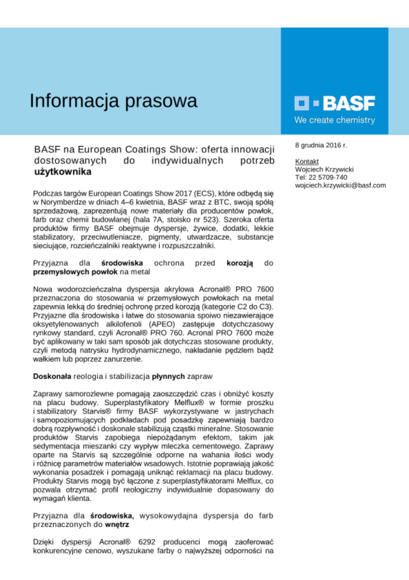 Podczas targów European Coatings Show 2017 (ECS), które odbędą się w Norymberdze w dniach 4–6 kwietnia, BASF wraz z BTC, swoją spółą sprzedażową, zaprezentują nowe materiały dla producentów powłok, farb oraz chemii budowlanej (hala 7A, stoisko nr 523). Szeroka oferta produktów firmy BASF obejmuje dyspersje, żywice, dodatki, lekkie stabilizatory, przeciwutleniacze, pigmenty, utwardzacze, substancje sieciujące, rozcieńczalniki reaktywne i rozpuszczalniki.