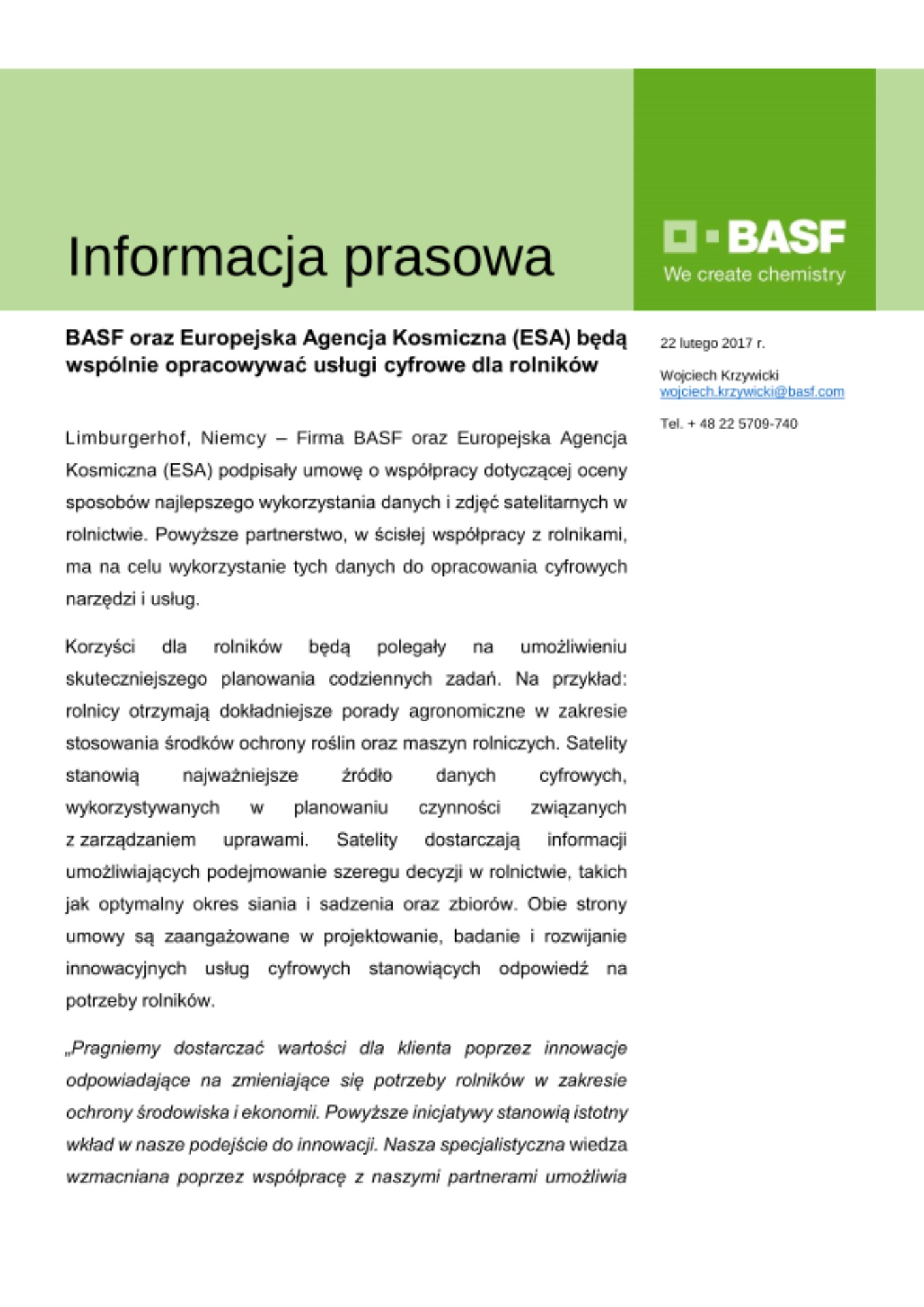 Limburgerhof, Niemcy – Firma BASF oraz Europejska Agencja Kosmiczna (ESA) podpisały umowę o współpracy dotyczącej oceny sposobów najlepszego wykorzystania danych i zdjęć satelitarnych w rolnictwie. Powyższe partnerstwo, w ścisłej współpracy z rolnikami, ma na celu wykorzystanie tych danych do opracowania cyfrowych narzędzi i usług.