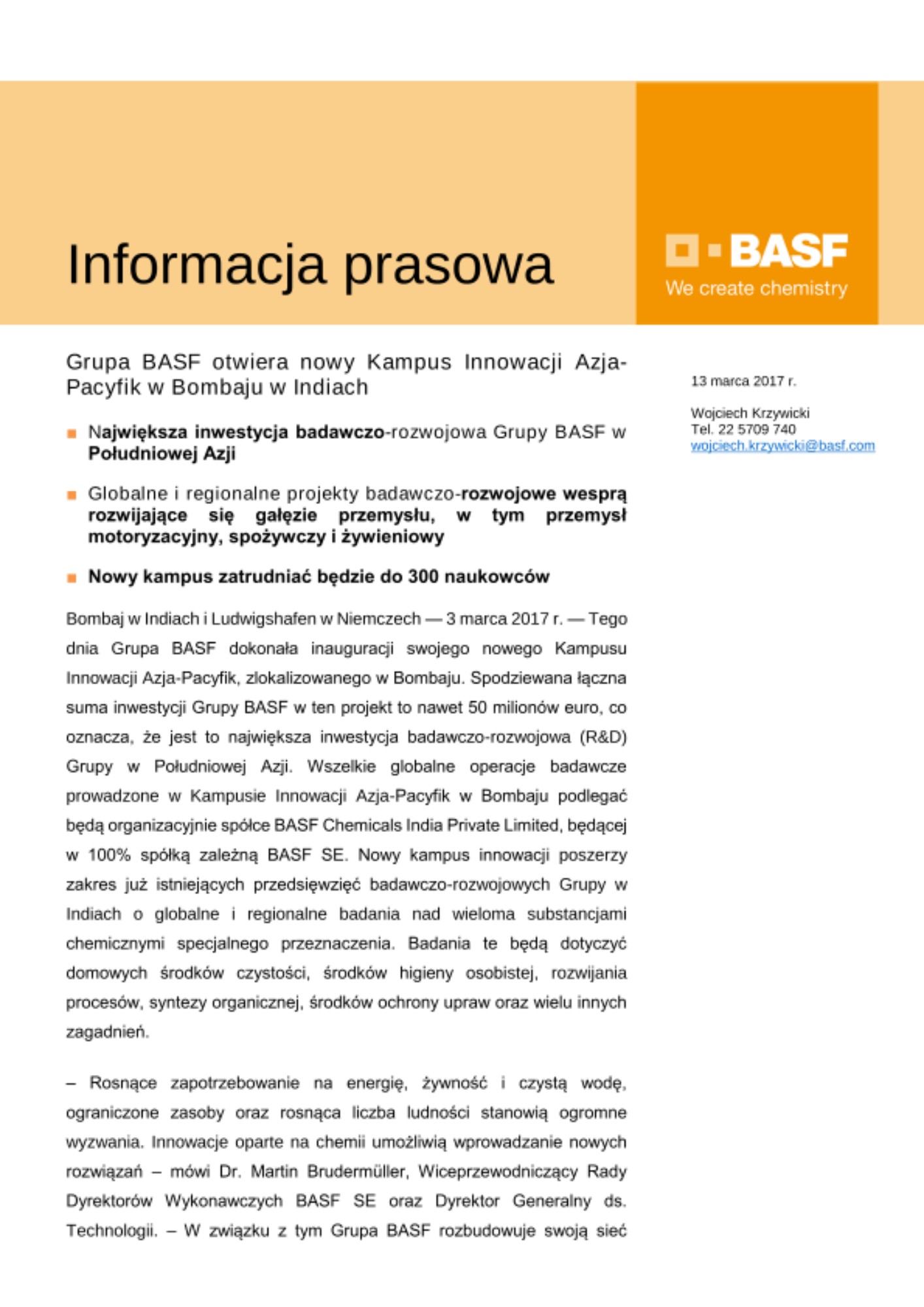 Bombaj w Indiach i Ludwigshafen w Niemczech — 3 marca 2017 r. — Tego dnia Grupa BASF dokonała inauguracji swojego nowego Kampusu Innowacji Azja-Pacyfik, zlokalizowanego w Bombaju. Spodziewana łączna suma inwestycji Grupy BASF w ten projekt to nawet 50 milionów euro, co oznacza, że jest to największa inwestycja badawczo-rozwojowa (R&D) Grupy w Południowej Azji. Wszelkie globalne operacje badawcze prowadzone w Kampusie Innowacji Azja-Pacyfik w Bombaju podlegać będą organizacyjnie spółce BASF Chemicals India Private Limited, będącej w 100% spółką zależną BASF SE. Nowy kampus innowacji poszerzy zakres już istniejących przedsięwzięć badawczo-rozwojowych Grupy w Indiach o globalne i regionalne badania nad wieloma substancjami chemicznymi specjalnego przeznaczenia. Badania te będą dotyczyć domowych środków czystości, środków higieny osobistej, rozwijania procesów, syntezy organicznej, środków ochrony upraw oraz wielu innych zagadnień.