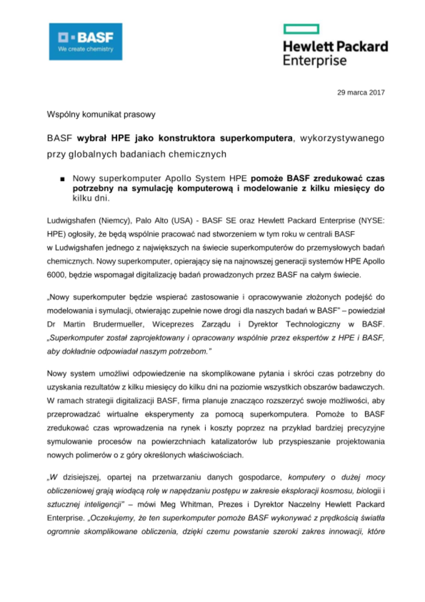 „W dzisiejszej, opartej na przetwarzaniu danych gospodarce, komputery o dużej mocy obliczeniowej grają wiodącą rolę w napędzaniu postępu w zakresie eksploracji kosmosu, biologii i sztucznej inteligencji” – mówi Meg Whitman, Prezes i Dyrektor Naczelny Hewlett Packard Enterprise. „Oczekujemy, że ten superkomputer pomoże BASF wykonywać z prędkością światła ogromnie skomplikowane obliczenia, dzięki czemu powstanie szeroki zakres innowacji, które pozwolą rozwiązać aktualne problemy i przyspieszą rozwój świata.”