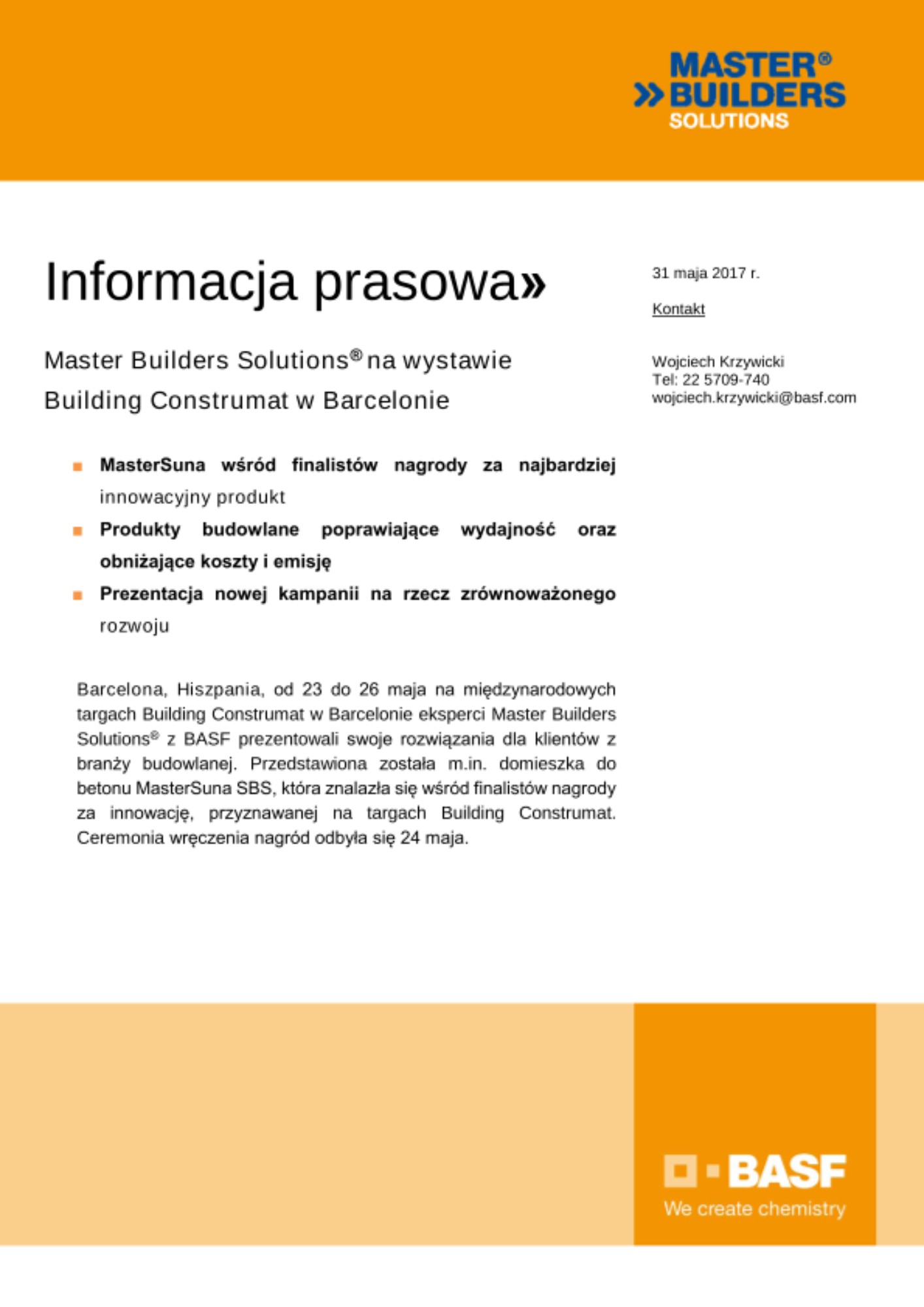 Barcelona, Hiszpania, od 23 do 26 maja na międzynarodowych targach Building Construmat w Barcelonie eksperci Master Builders Solutions® z BASF prezentowali swoje rozwiązania dla klientów z branży budowlanej. Przedstawiona została m.in. domieszka do betonu MasterSuna SBS, która znalazła się wśród finalistów nagrody za innowację, przyznawanej na targach Building Construmat. Ceremonia wręczenia nagród odbyła się 24 maja.