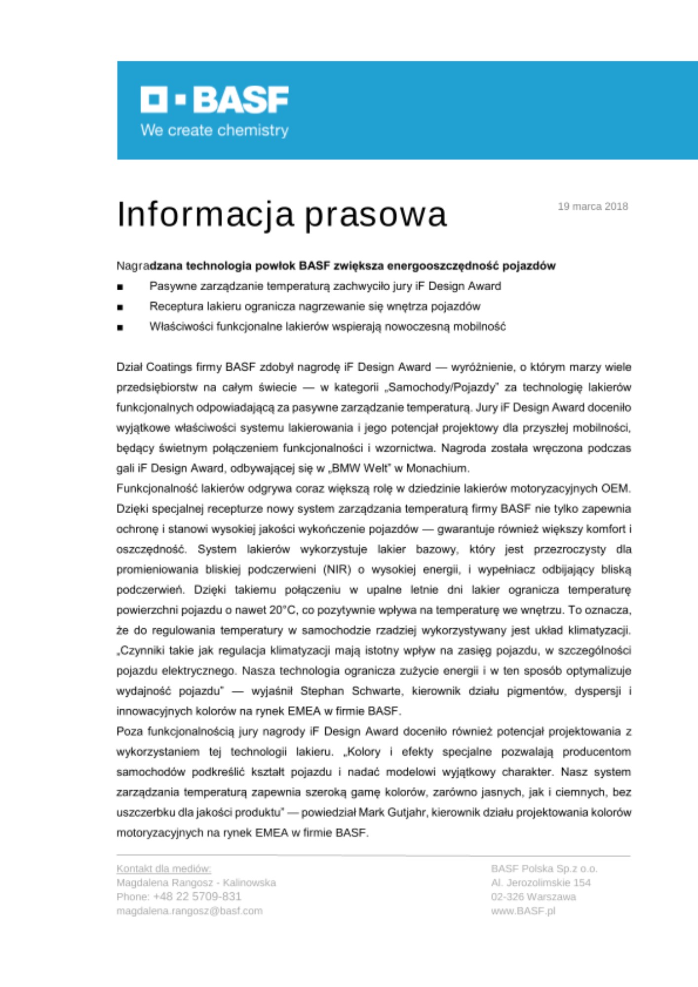 Dział Coatings firmy BASF zdobył nagrodę iF Design Award — wyróżnienie, o którym marzy wiele przedsiębiorstw na całym świecie — w kategorii „Samochody/Pojazdy” za technologię lakierów funkcjonalnych odpowiadającą za pasywne zarządzanie temperaturą. Jury iF Design Award doceniło wyjątkowe właściwości systemu lakierowania i jego potencjał projektowy dla przyszłej mobilności, będący świetnym połączeniem funkcjonalności i wzornictwa. Nagroda została wręczona podczas gali iF Design Award, odbywającej się w „BMW Welt” w Monachium