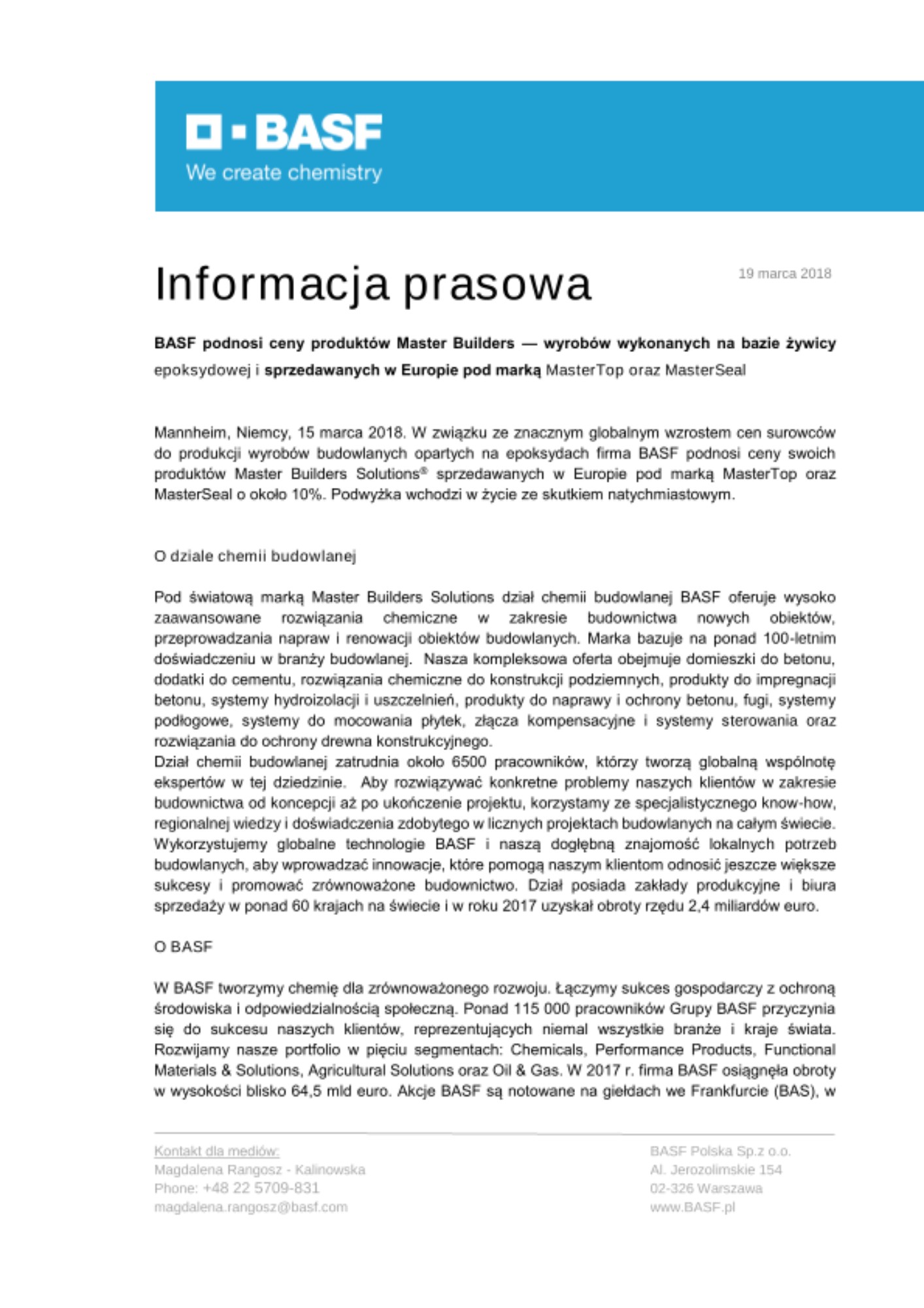 Mannheim, Niemcy, 15 marca 2018. W związku ze znacznym globalnym wzrostem cen surowców do produkcji wyrobów budowlanych opartych na epoksydach firma BASF podnosi ceny swoich produktów Master Builders Solutions® sprzedawanych w Europie pod marką MasterTop oraz MasterSeal o około 10%. Podwyżka wchodzi w życie ze skutkiem natychmiastowym.