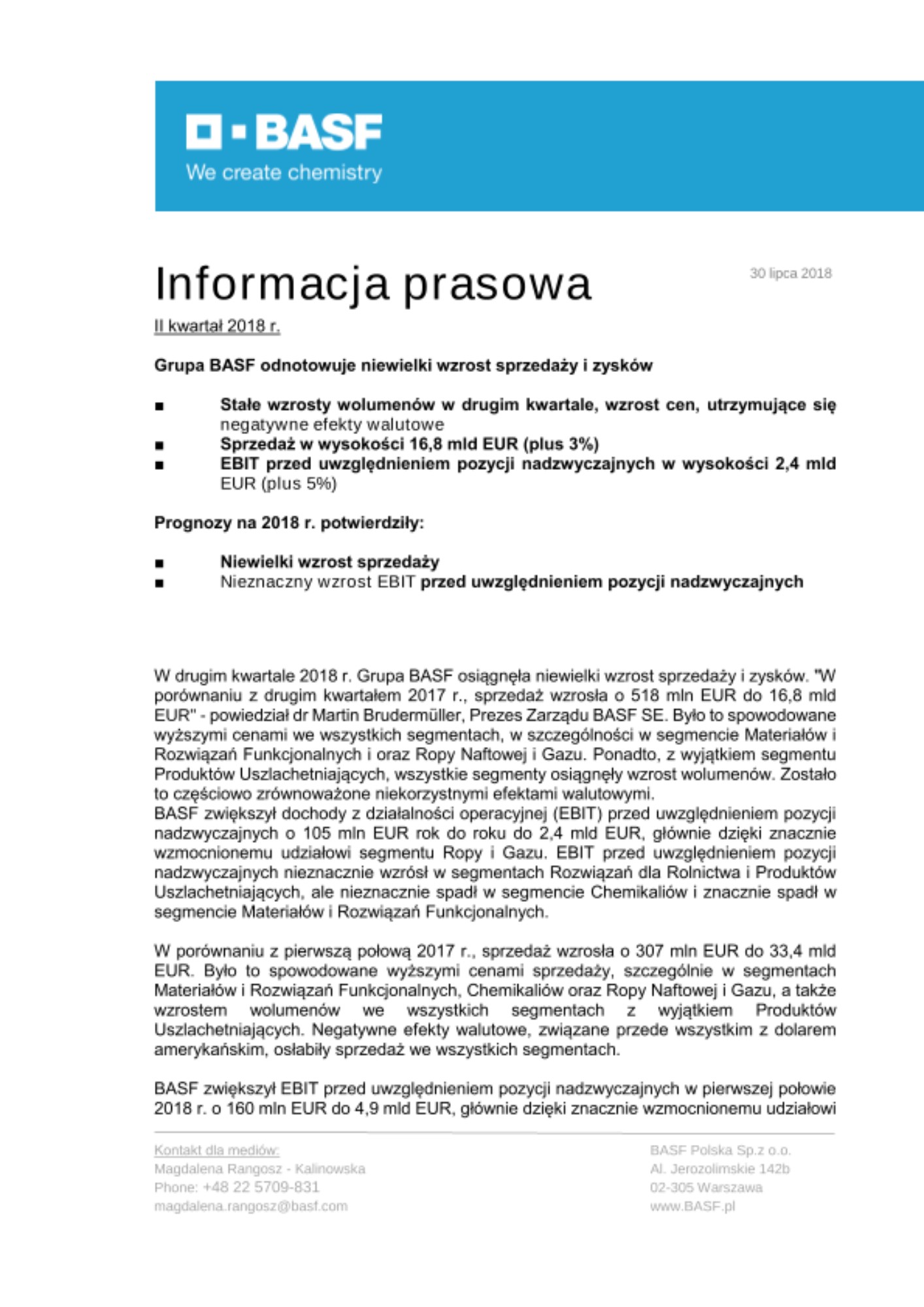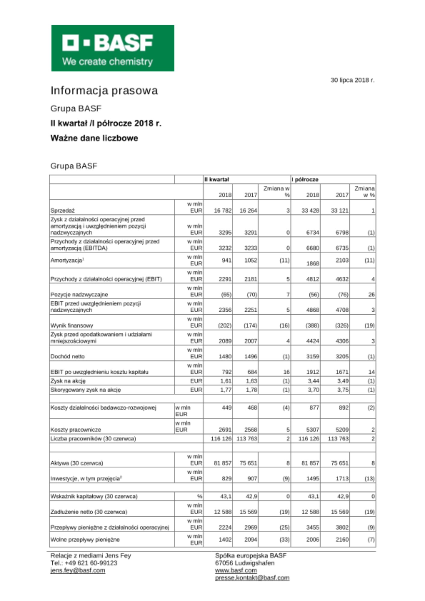 W drugim kwartale 2018 r. Grupa BASF osiągnęła niewielki wzrost sprzedaży i zysków. "W porównaniu z drugim kwartałem 2017 r., sprzedaż wzrosła o 518 mln EUR do 16,8 mld EUR" - powiedział dr Martin Brudermüller, Prezes Zarządu BASF SE. Było to spowodowane wyższymi cenami we wszystkich segmentach, w szczególności w segmencie Materiałów i Rozwiązań Funkcjonalnych i oraz Ropy Naftowej i Gazu. Ponadto, z wyjątkiem segmentu Produktów Uszlachetniających, wszystkie segmenty osiągnęły wzrost wolumenów. Zostało to częściowo zrównoważone niekorzystnymi efektami walutowymi.