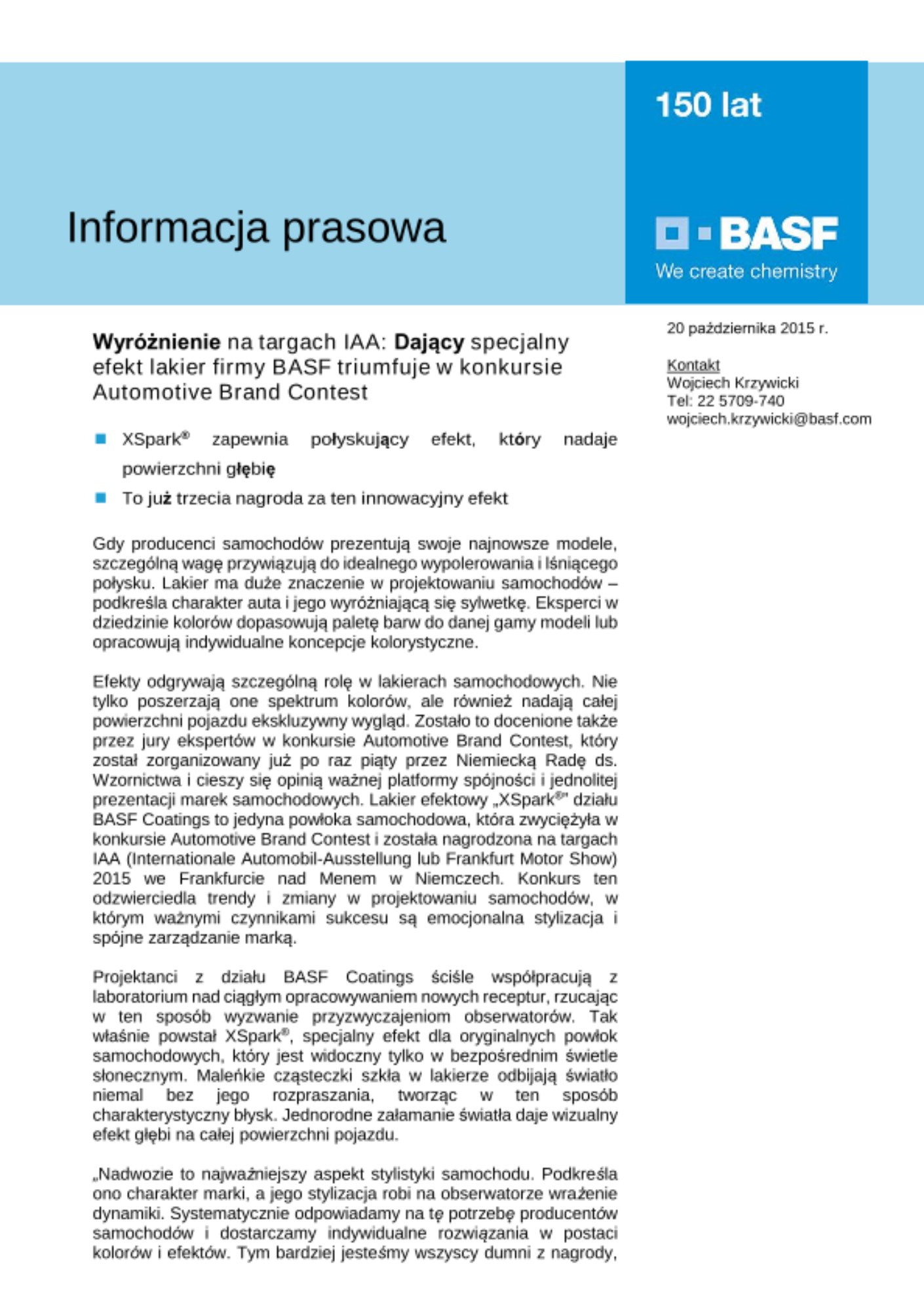 Efekty odgrywają szczególną rolę w lakierach samochodowych. Nie tylko poszerzają one spektrum kolorów, ale również nadają całej powierzchni pojazdu ekskluzywny wygląd. Zostało to docenione także przez jury ekspertów w konkursie Automotive Brand Contest, który został zorganizowany już po raz piąty przez Niemiecką Radę ds. Wzornictwa i cieszy się opinią ważnej platformy spójności i jednolitej prezentacji marek samochodowych. Lakier efektowy „XSpark®” działu BASF Coatings to jedyna powłoka samochodowa, która zwyciężyła w konkursie Automotive Brand Contest i została nagrodzona na targach IAA (Internationale Automobil-Ausstellung lub Frankfurt Motor Show) 2015 we Frankfurcie nad Menem w Niemczech. Konkurs ten odzwierciedla trendy i zmiany w projektowaniu samochodów, w którym ważnymi czynnikami sukcesu są emocjonalna stylizacja i spójne zarządzanie marką.