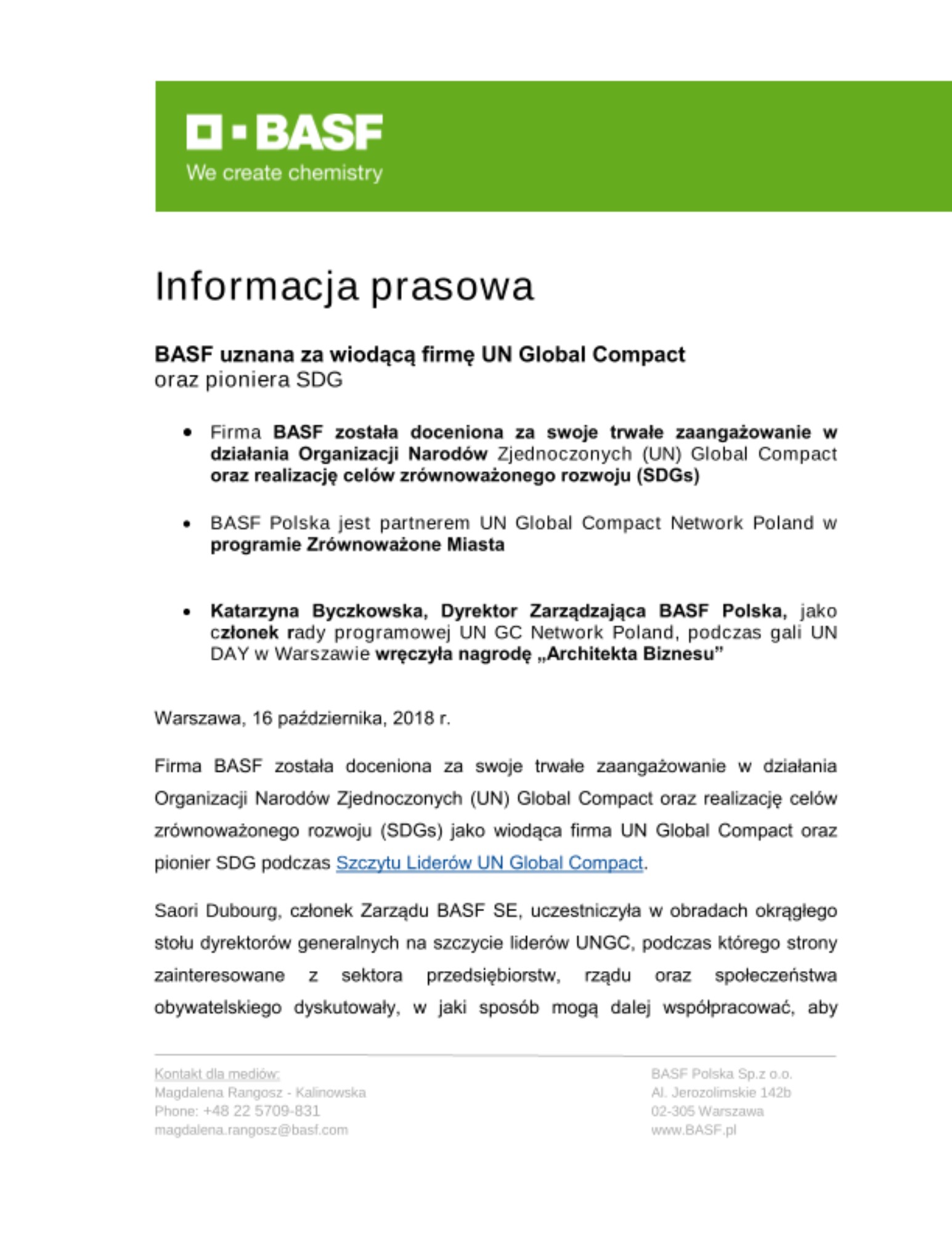 Dn. 15 października 2018 r. w ramach Gali UN DAY w Warszawie odbyła się inauguracja Global Compact Poland Yearbook 2018/2019, który jest strategicznymraportem Global Compact Network Poland. Publikacja zawiera prezentacje aktywności w oparciu o Cele Zrównoważonego Rozwoju (SDG’s) przyjęte przez Zgromadzenie Ogólne ONZ w 2015 roku, a także ukazuje implementacje SDGwśród polskich członków UN Global Compact i partnerów. W raporcie znalazło siępodsumowanie zaangażowania BASF Polska, partnera UN Global CompactNetwork Poland w programie Zrównoważone Miasta, w realizację celu 11. poprzezdostarczanie innowacyjnych rozwiązań na rzecz poprawy jakości powietrza.Katarzyna Byczkowska, Dyrektor Zarządzająca BASF Polska, jako członek radyprogramowej UN GC Network Poland, podczas gali UN DAY wręczyła nagrodę „Architekta Biznesu”.
