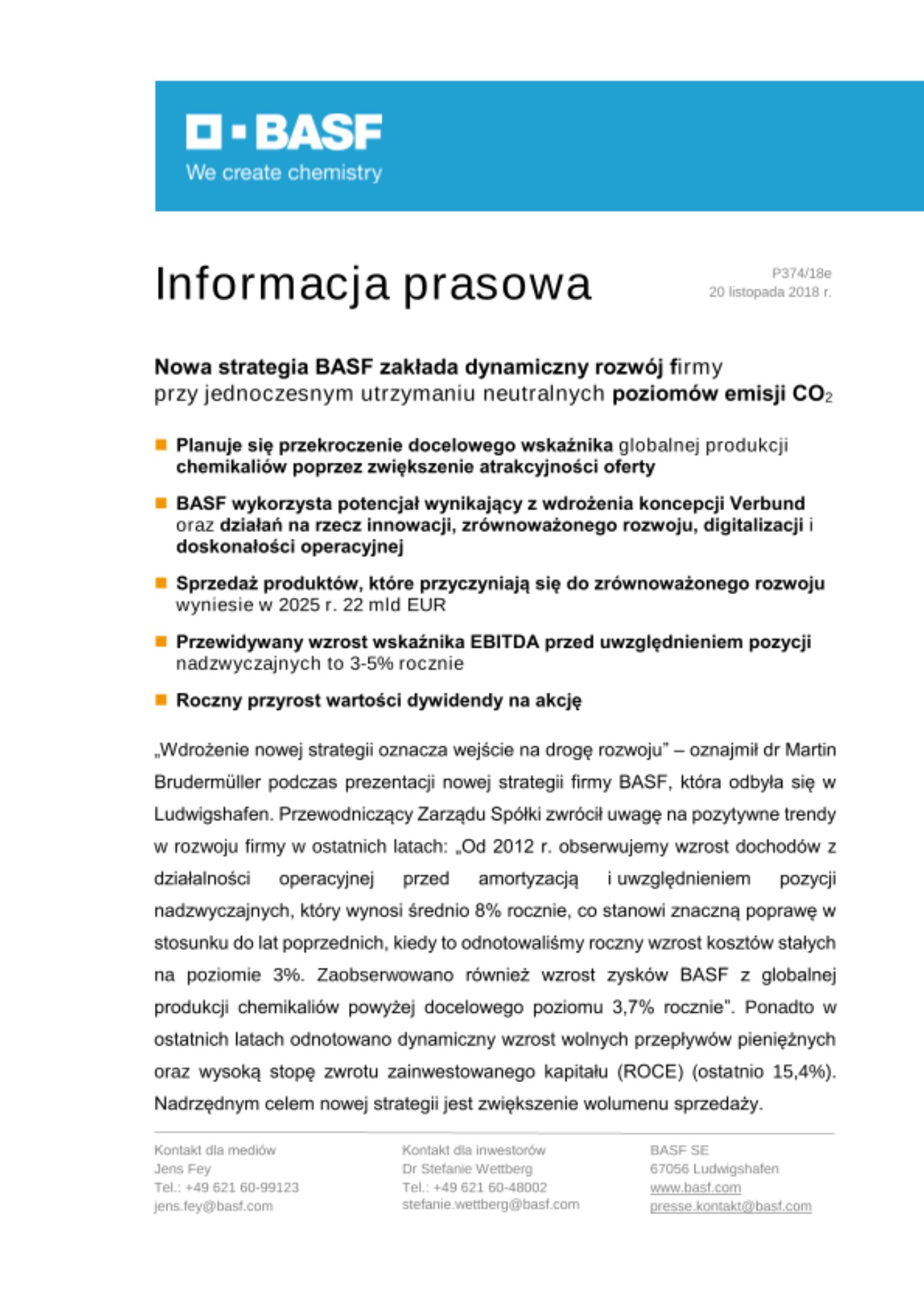 Niniejsza informacja prasowa zawiera oświadczenia dotyczące przyszłości, które zostały opracowane na podstawie aktualnych szacunków i prognoz Zarządu oraz innych dostępnych informacji. Oświadczenia dotyczące przyszłości nie stanowią gwarancji, że określone w niniejszym dokumencie cele i rezultaty zostaną zrealizowane. Zależy to od wielu czynników, w tym od poziomu ryzyka i niepewności oraz stopnia realizacji założonych celów. Obowiązujące przepisy prawa nie nakładają na firmę BASF obowiązku aktualizowania powyższych oświadczeń.