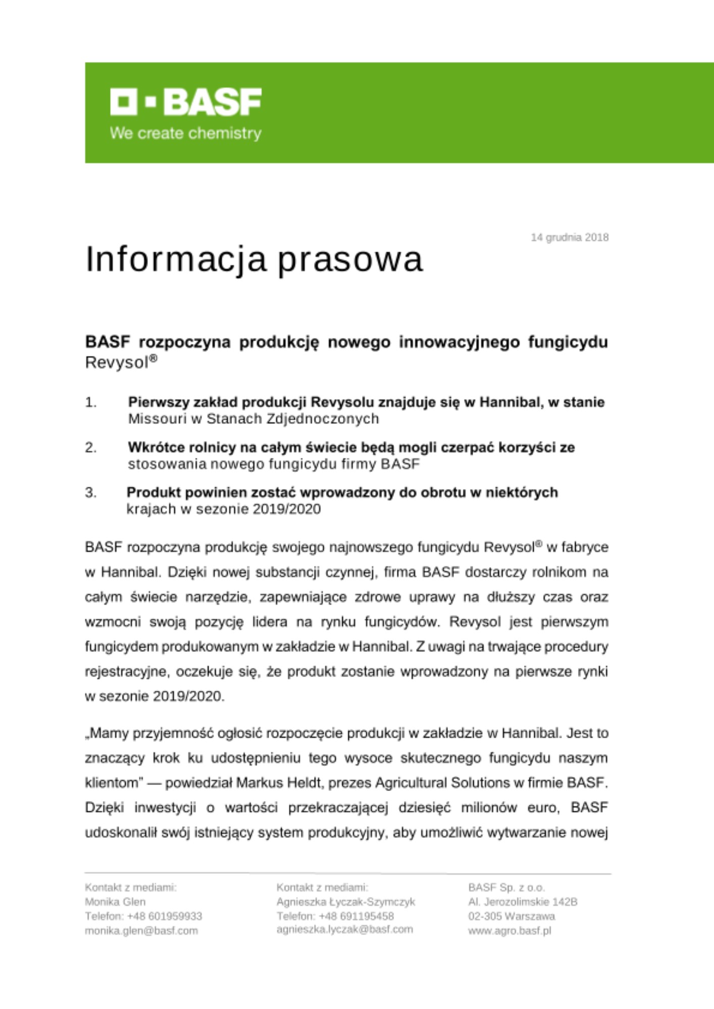 BASF rozpoczyna produkcję swojego najnowszego fungicydu Revysol® w fabryce w Hannibal. Dzięki nowej substancji czynnej, firma BASF dostarczy rolnikom na całym świecie narzędzie, zapewniające zdrowe uprawy na dłuższy czas oraz wzmocni swoją pozycję lidera na rynku fungicydów. Revysol jest pierwszym fungicydem produkowanym w zakładzie w Hannibal. Z uwagi na trwające procedury rejestracyjne, oczekuje się, że produkt zostanie wprowadzony na pierwsze rynki w sezonie 2019/2020.