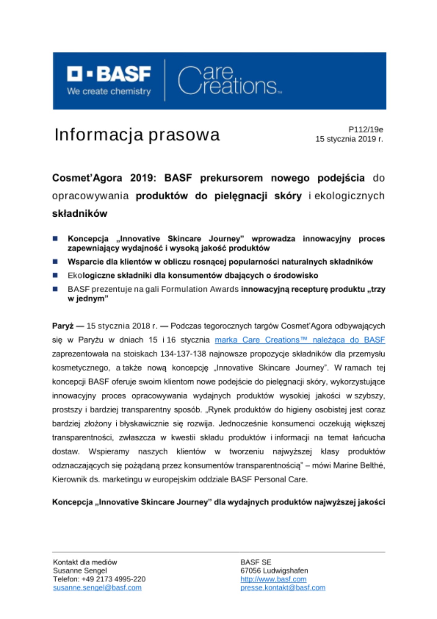Paryż — 15 stycznia 2018 r. — Podczas tegorocznych targów Cosmet’Agora odbywających się w Paryżu w dniach 15 i 16 stycznia marka Care Creations™ należąca do BASF zaprezentowała na stoiskach 134-137-138 najnowsze propozycje składników dla przemysłu kosmetycznego, a także nową koncepcję „Innovative Skincare Journey”. W ramach tej koncepcji BASF oferuje swoim klientom nowe podejście do pielęgnacji skóry, wykorzystujące innowacyjny proces opracowywania wydajnych produktów wysokiej jakości w szybszy, prostszy i bardziej transparentny sposób. „Rynek produktów do higieny osobistej jest coraz bardziej złożony i błyskawicznie się rozwija. Jednocześnie konsumenci oczekują większej transparentności, zwłaszcza w kwestii składu produktów i informacji na temat łańcucha dostaw. Wspieramy naszych klientów w tworzeniu najwyższej klasy produktów odznaczających się pożądaną przez konsumentów transparentnością” – mówi Marine Belthé, Kierownik ds. marketingu w europejskim oddziale BASF Personal Care.