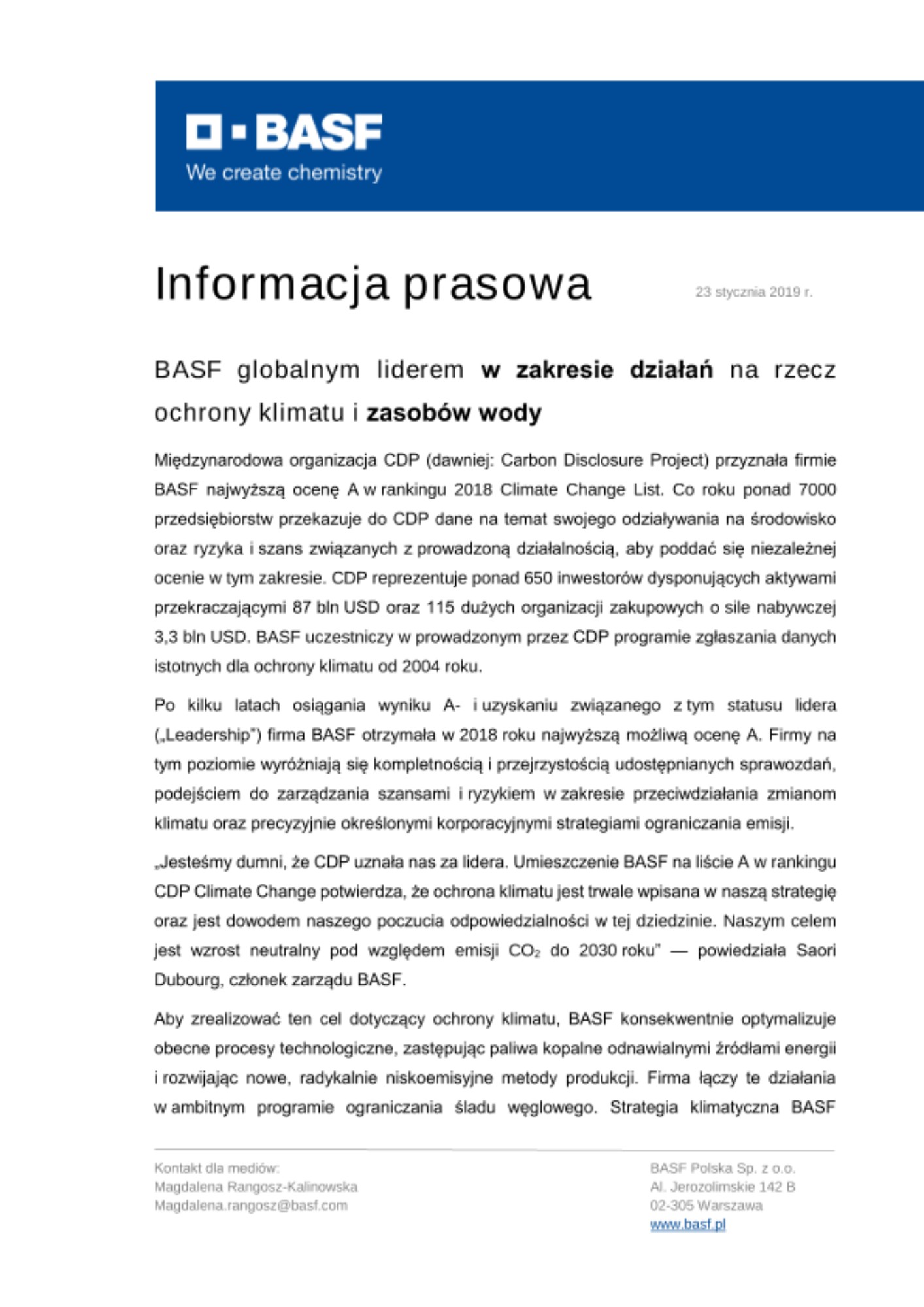 Międzynarodowa organizacja CDP (dawniej: Carbon Disclosure Project) przyznała firmie BASF najwyższą ocenę A w rankingu 2018 Climate Change List. Co roku ponad 7000 przedsiębiorstw przekazuje do CDP dane na temat swojego odziaływania na środowisko oraz ryzyka i szans związanych z prowadzoną działalnością, aby poddać się niezależnej ocenie w tym zakresie. CDP reprezentuje ponad 650 inwestorów dysponujących aktywami przekraczającymi 87 bln USD oraz 115 dużych organizacji zakupowych o sile nabywczej 3,3 bln USD. BASF uczestniczy w prowadzonym przez CDP programie zgłaszania danych istotnych dla ochrony klimatu od 2004 roku.