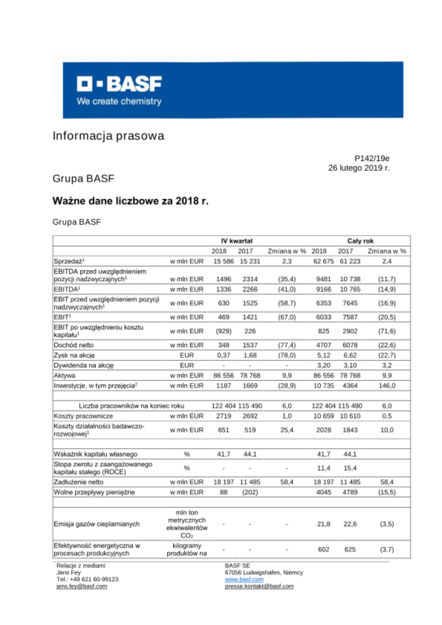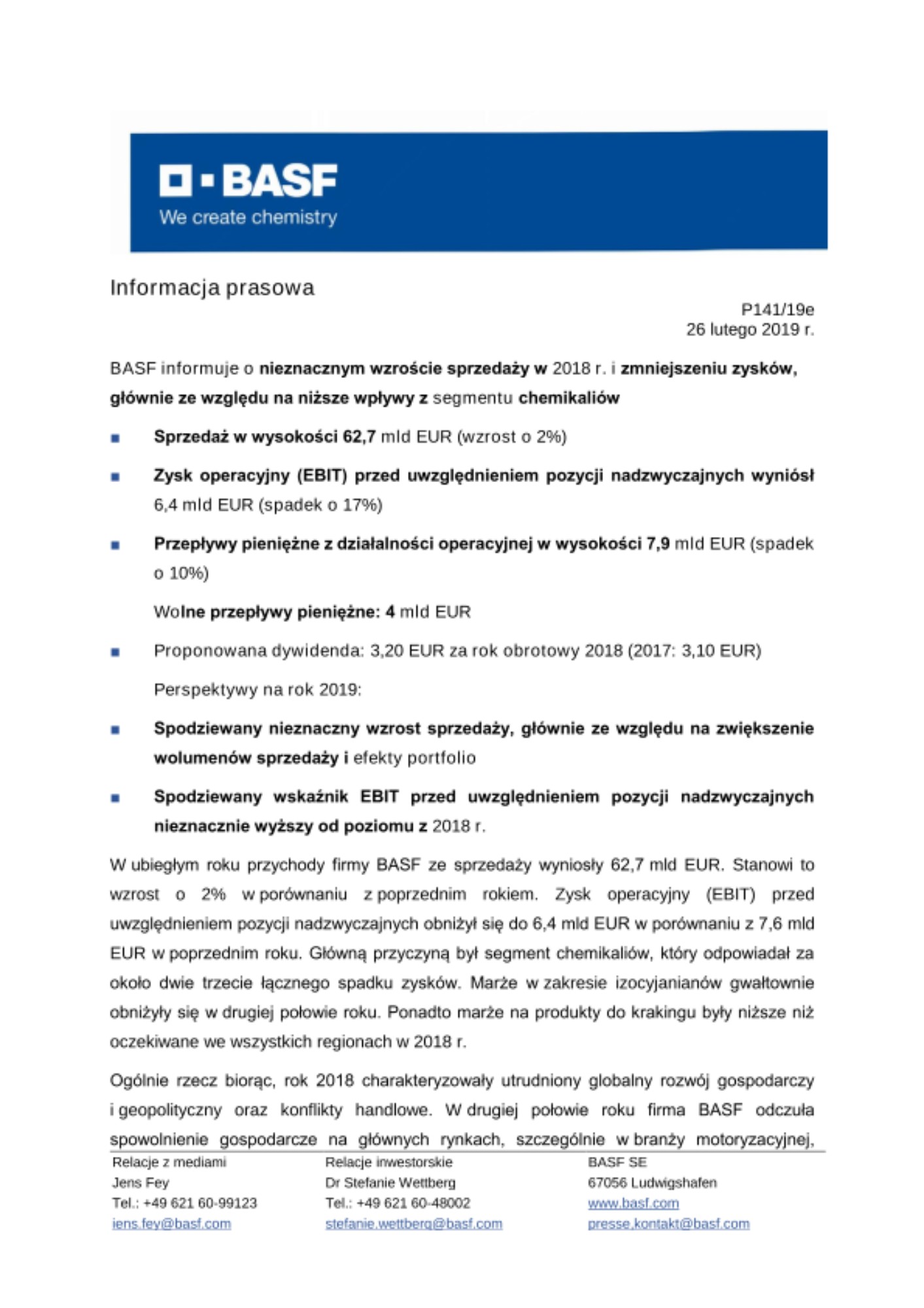 W ubiegłym roku przychody firmy BASF ze sprzedaży wyniosły 62,7 mld EUR. Stanowi to wzrost o 2% w porównaniu z poprzednim rokiem. Zysk operacyjny (EBIT) przed uwzględnieniem pozycji nadzwyczajnych obniżył się do 6,4 mld EUR w porównaniu z 7,6 mld EUR w poprzednim roku. Główną przyczyną był segment chemikaliów, który odpowiadał za około dwie trzecie łącznego spadku zysków. Marże w zakresie izocyjanianów gwałtownie obniżyły się w drugiej połowie roku. Ponadto marże na produkty do krakingu były niższe niż oczekiwane we wszystkich regionach w 2018 r.