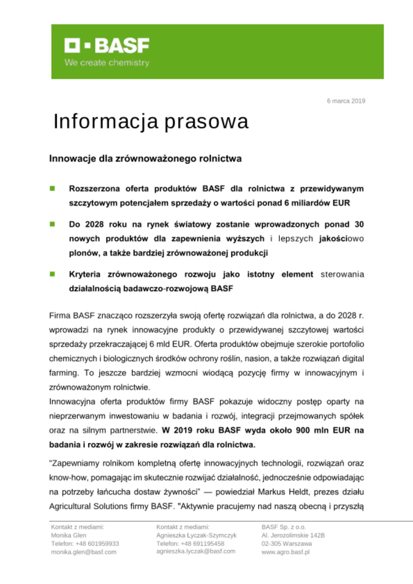 "Innowacja jest koniecznością w naszej branży. Łączymy naszą pasję i doświadczenie w zakresie innowacyjnego myślenia z głębokim zrozumieniem rzeczywistych wyzwań stojących przed rolnikami i rolnictwem. Koncentrujemy się na rozwoju opartym na innowacjach, ukierunkowanym rozszerzaniu portfolio produktów i na korzystaniu z wzajemnej współpracy przejętych spółek. Jako nowy, jeszcze silniejszy zespół jesteśmy teraz w wyjątkowej sytuacji, aby podbijać nowe rynki dzięki wiodącym produktom, narzędziom i rozwiązaniom, które spełniają potrzeby naszych klientów. Opierając się na tych możliwościach, będziemy się rozwijać w sposób zrównoważony i wykorzystywać nasze zaangażowanie w przyszłość rolnictwa” — podkreślił Heldt. Te produkty i rozwiązania są reprezentatywne dla 30 projektów, które zostaną wdrożone globalnie do 2028 roku. Pochodzą one z unikalnej innowacyjnej oferty produktów opartej na ciągłych pracach badawczych. BASF zamierza utrzymać poziom wydatków na rozszerzone i zintegrowane badania i rozwój w rolnictwie na tak samo wysokim poziomie, jak miało to miejsce w poprzednich latach. W samym 2018 roku firma BASF wydała 679 mln EUR na badania i rozwój w dziale rozwiązań dla rolnictwa; co stanowi około 11% sprzedaży w segmencie.