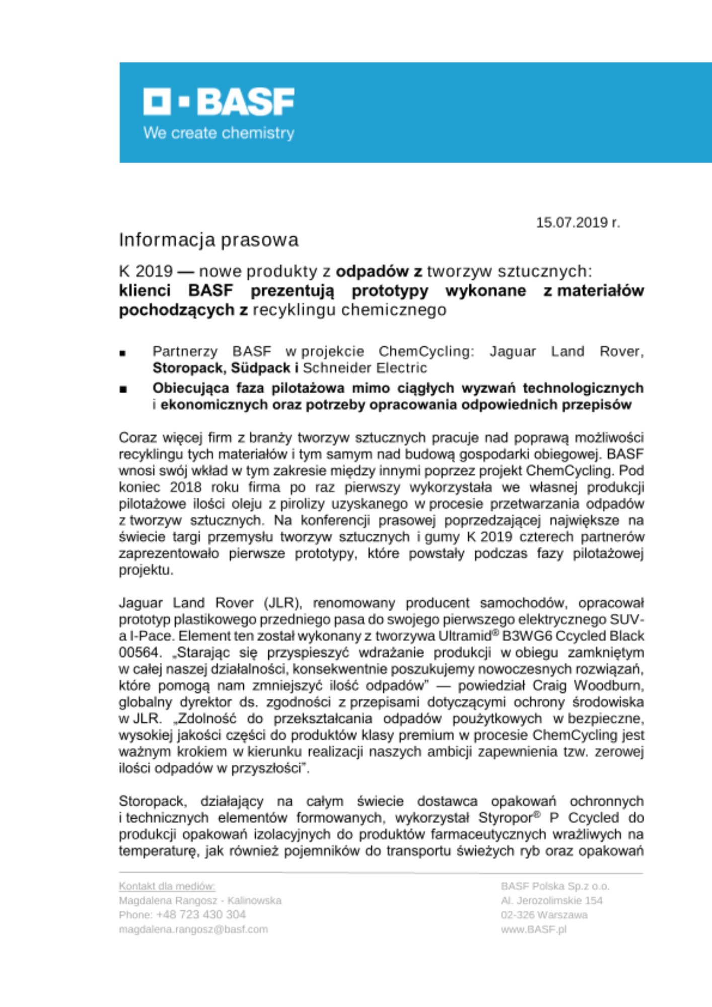 Coraz więcej firm z branży tworzyw sztucznych pracuje nad poprawą możliwości recyklingu tych materiałów i tym samym nad budową gospodarki obiegowej. BASF wnosi swój wkład w tym zakresie między innymi poprzez projekt ChemCycling. Pod koniec 2018 roku firma po raz pierwszy wykorzystała we własnej produkcji pilotażowe ilości oleju z pirolizy uzyskanego w procesie przetwarzania odpadów z tworzyw sztucznych. Na konferencji prasowej poprzedzającej największe na świecie targi przemysłu tworzyw sztucznych i gumy K 2019 czterech partnerów zaprezentowało pierwsze prototypy, które powstały podczas fazy pilotażowej projektu.