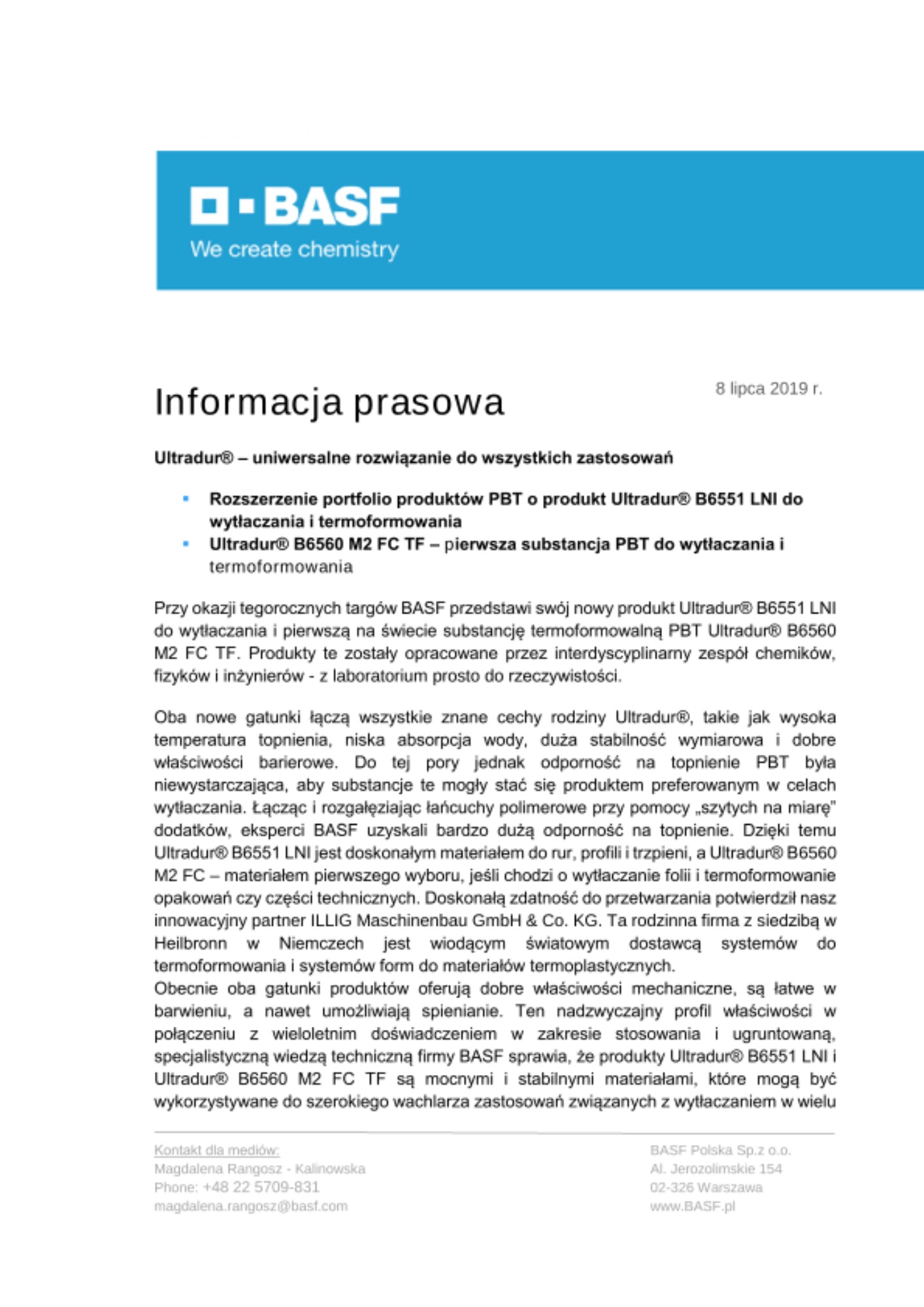 - Rozszerzenie portfolio produktów PBT o produkt Ultradur® B6551 LNI do wytłaczania i termoformowania