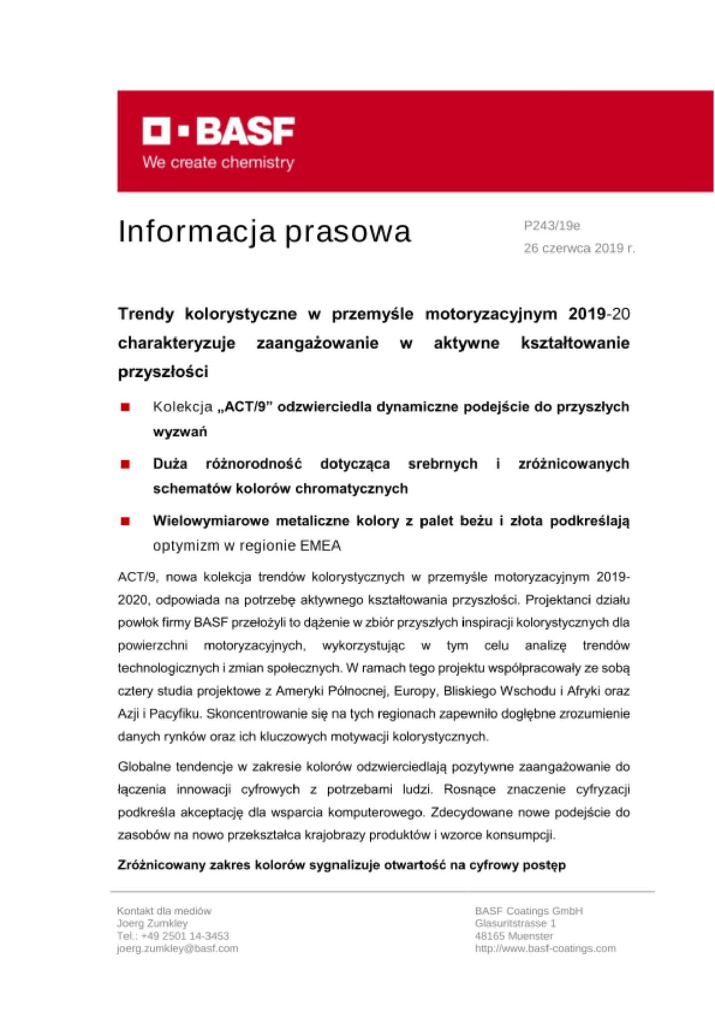 ACT/9, nowa kolekcja trendów kolorystycznych w przemyśle motoryzacyjnym 2019-2020, odpowiada na potrzebę aktywnego kształtowania przyszłości. Projektanci działu powłok firmy BASF przełożyli to dążenie w zbiór przyszłych inspiracji kolorystycznych dla powierzchni motoryzacyjnych, wykorzystując w tym celu analizę trendów technologicznych i zmian społecznych. W ramach tego projektu współpracowały ze sobą cztery studia projektowe z Ameryki Północnej, Europy, Bliskiego Wschodu i Afryki oraz Azji i Pacyfiku. Skoncentrowanie się na tych regionach zapewniło dogłębne zrozumienie danych rynków oraz ich kluczowych motywacji kolorystycznych.