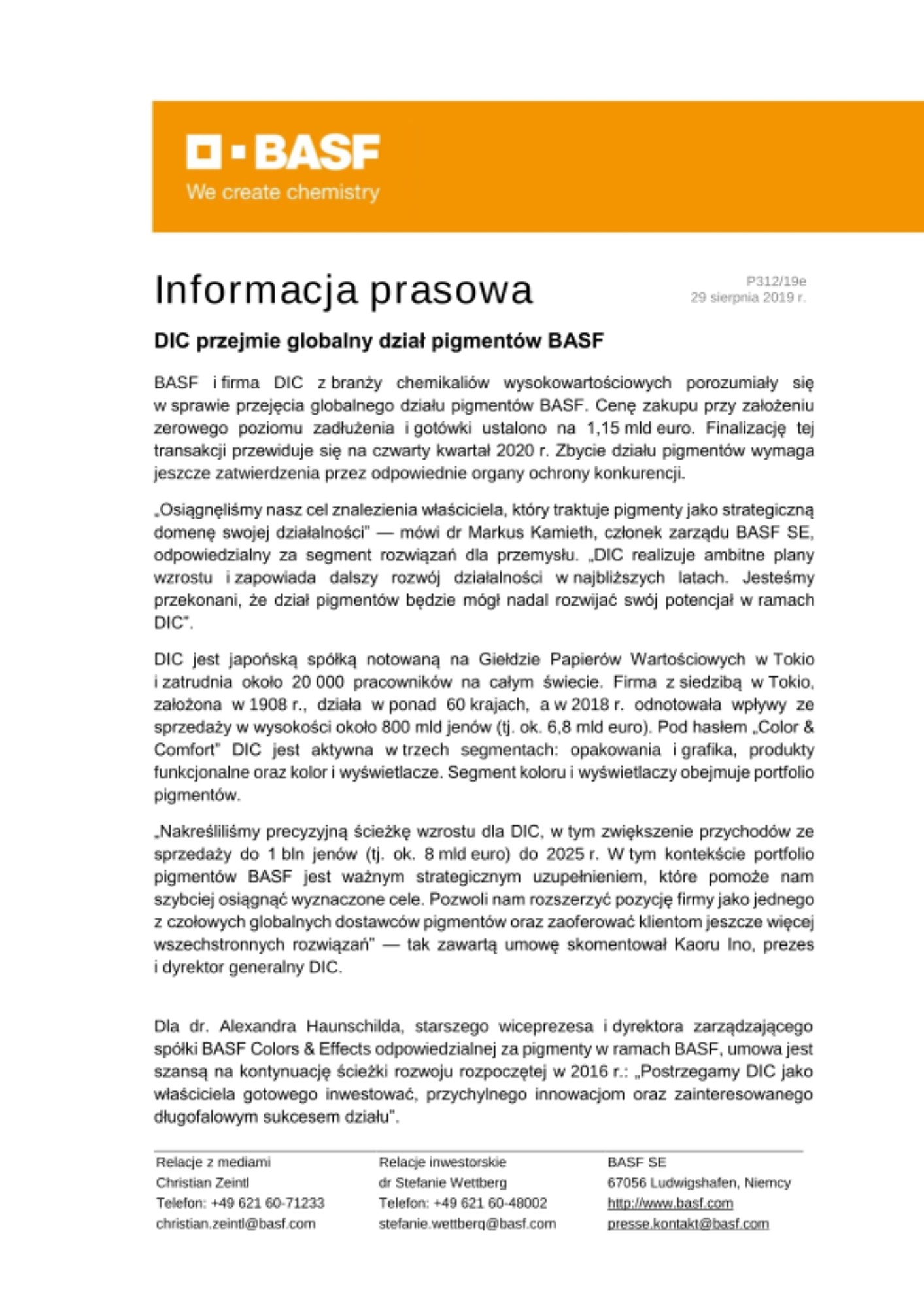 BASF i firma DIC z branży chemikaliów wysokowartościowych porozumiały się w sprawie przejęcia globalnego działu pigmentów BASF. Cenę zakupu przy założeniu zerowego poziomu zadłużenia i gotówki ustalono na 1,15 mld euro. Finalizację tej transakcji przewiduje się na czwarty kwartał 2020 r. Zbycie działu pigmentów wymaga jeszcze zatwierdzenia przez odpowiednie organy ochrony konkurencji.