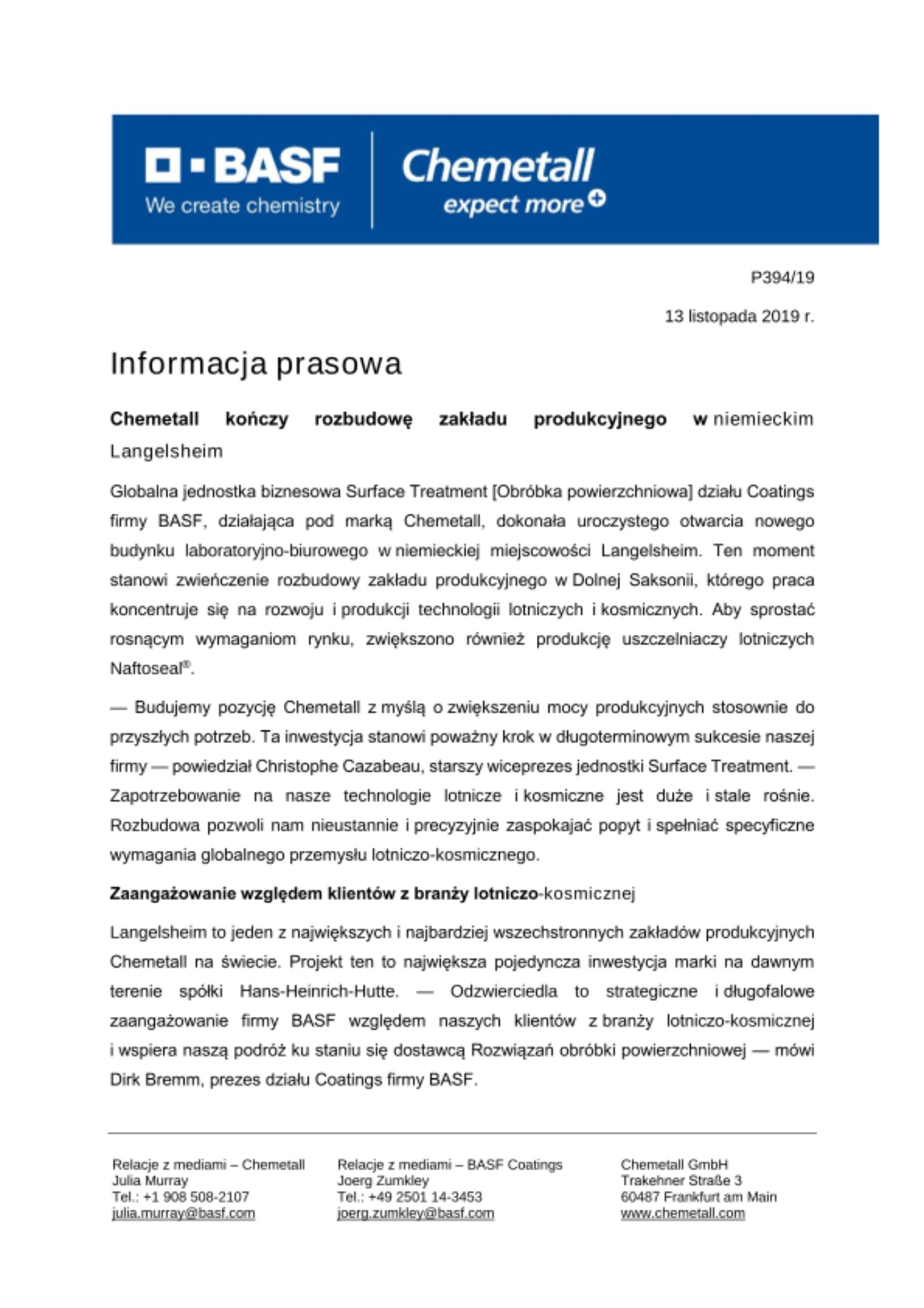 Langelsheim to jeden z największych i najbardziej wszechstronnych zakładów produkcyjnych Chemetall na świecie. Projekt ten to największa pojedyncza inwestycja marki na dawnym terenie spółki Hans-Heinrich-Hutte. — Odzwierciedla to strategiczne i długofalowe zaangażowanie firmy BASF względem naszych klientów z branży lotniczo-kosmicznej i wspiera naszą podróż ku staniu się dostawcą Rozwiązań obróbki powierzchniowej — mówi Dirk Bremm, prezes działu Coatings firmy BASF.