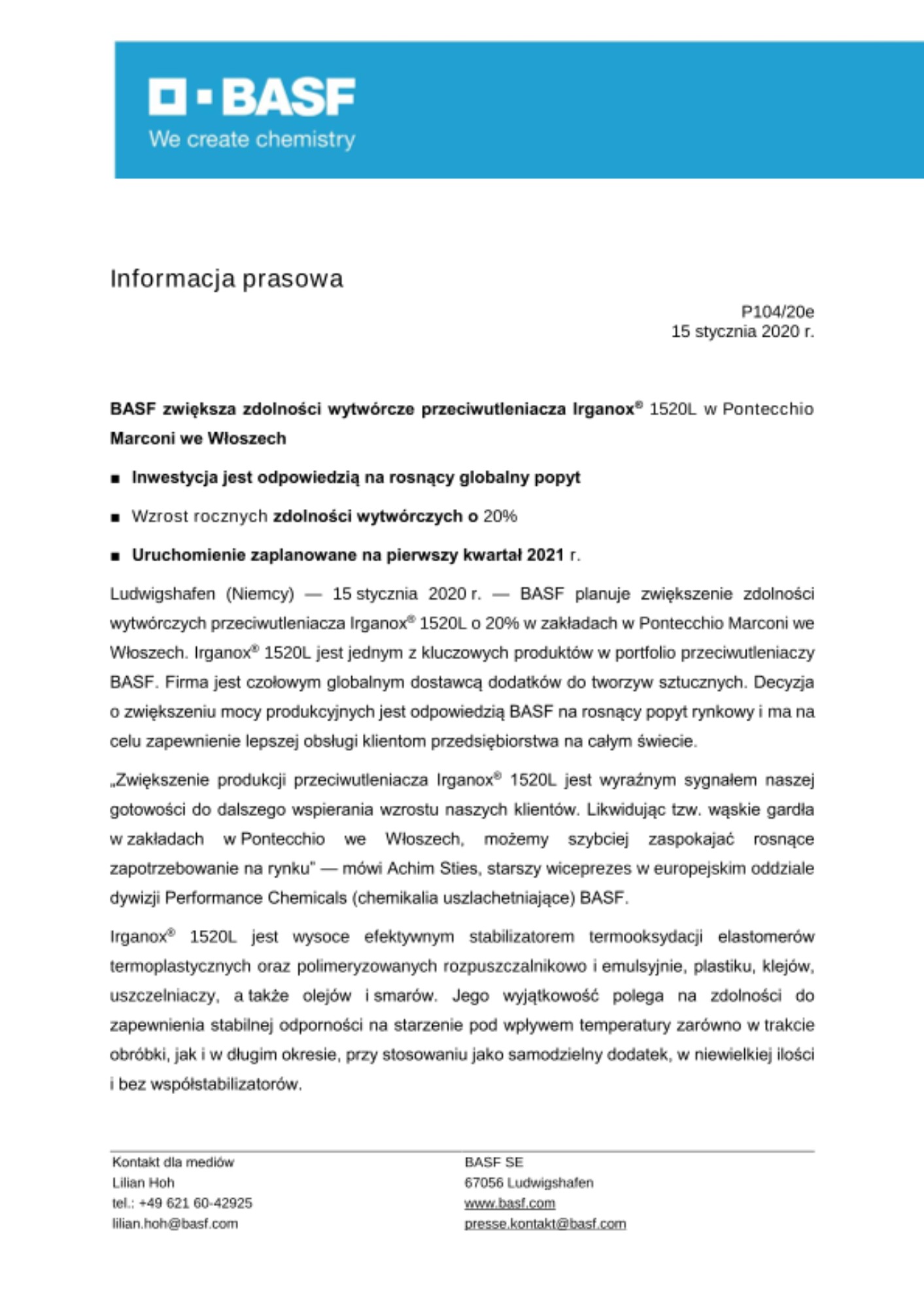Ludwigshafen (Niemcy) — 15 stycznia 2020 r. — BASF planuje zwiększenie zdolności wytwórczych przeciwutleniacza Irganox® 1520L o 20% w zakładach w Pontecchio Marconi we Włoszech. Irganox® 1520L jest jednym z kluczowych produktów w portfolio przeciwutleniaczy BASF. Firma jest czołowym globalnym dostawcą dodatków do tworzyw sztucznych. Decyzja o zwiększeniu mocy produkcyjnych jest odpowiedzią BASF na rosnący popyt rynkowy i ma na celu zapewnienie lepszej obsługi klientom przedsiębiorstwa na całym świecie.