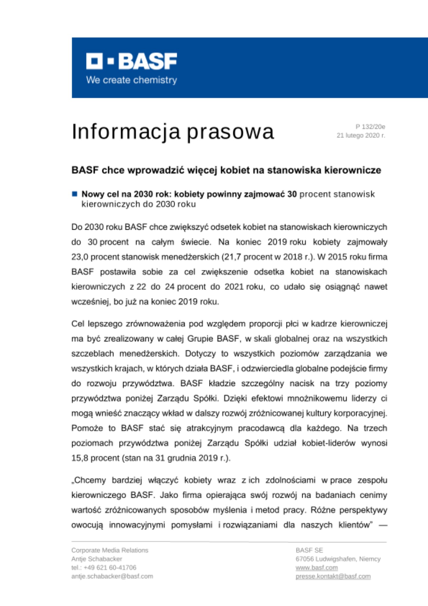 – Chcemy bardziej włączyć kobiety wraz z ich zdolnościami w prace zespołu kierowniczego BASF. Jako firma opierająca swój rozwój na badaniach cenimy wartość zróżnicowanych sposobów myślenia i metod pracy. Różne perspektywy owocują innowacyjnymi pomysłami i rozwiązaniami dla naszych klientów — powiedział dr Martin Brudermüller, prezes Zarządu BASF SE.