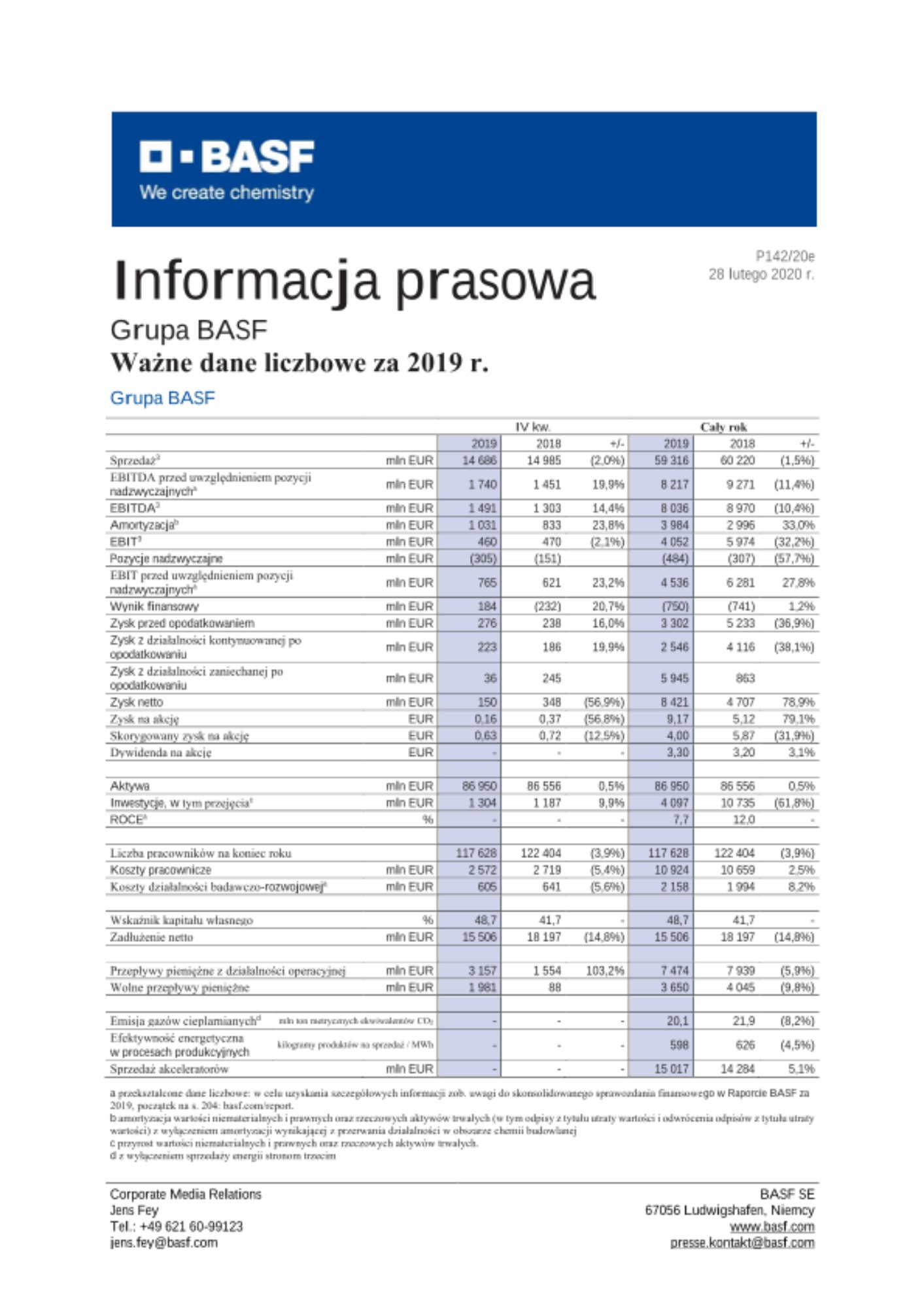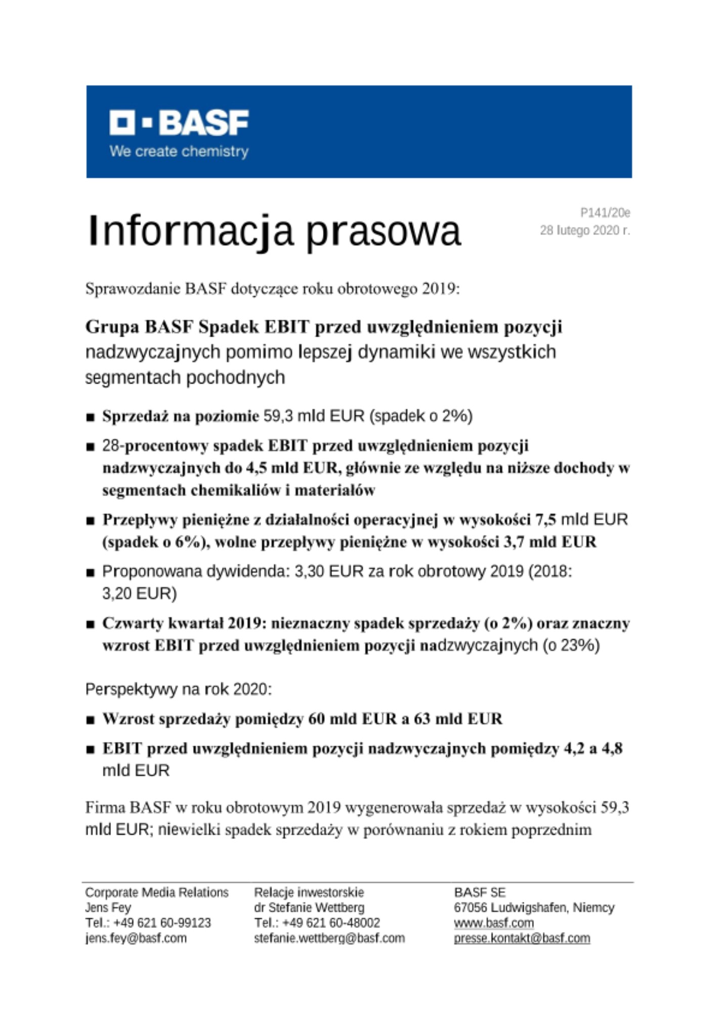 | Raport Roczny BASF 2019 (od godz. 7:00 czasu środkowoeuropejskiego) | ||