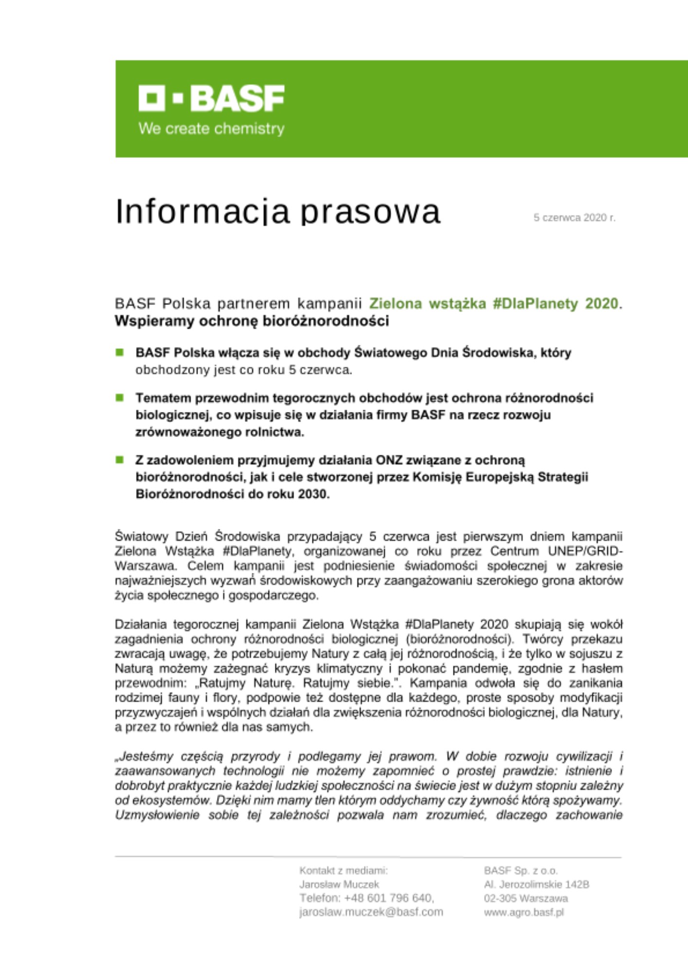 - BASF Polska włącza się w obchody Światowego Dnia Środowiska, który obchodzony jest co roku 5 czerwca.