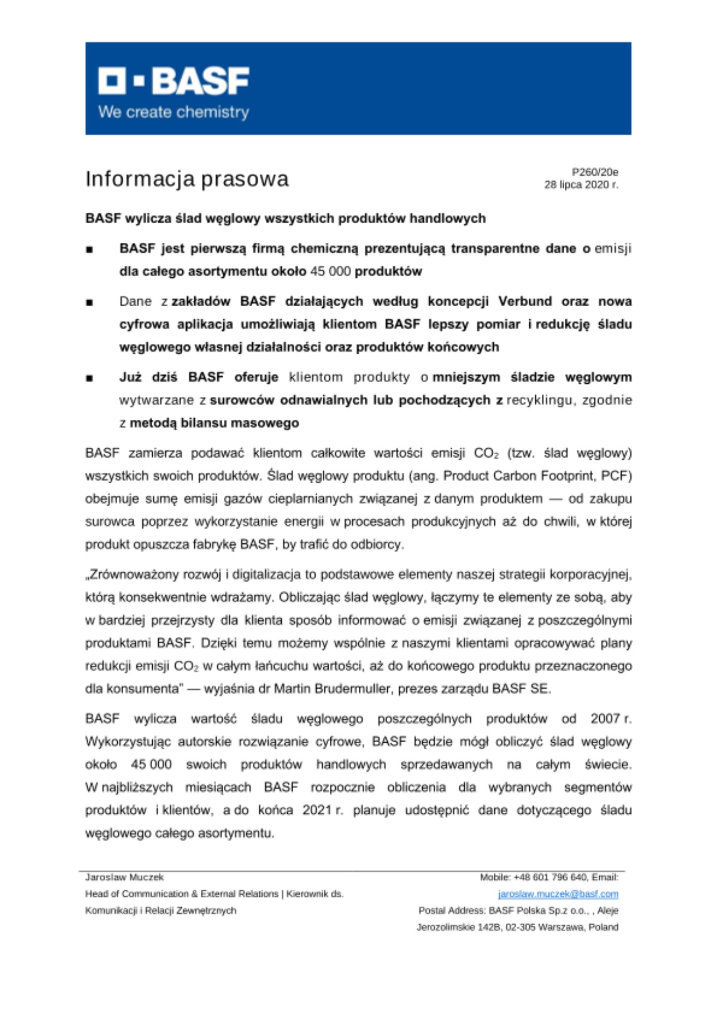 „Zrównoważony rozwój i digitalizacja to podstawowe elementy naszej strategii korporacyjnej, którą konsekwentnie wdrażamy. Obliczając ślad węglowy, łączymy te elementy ze sobą, aby w bardziej przejrzysty dla klienta sposób informować o emisji związanej z poszczególnymi produktami BASF. Dzięki temu możemy wspólnie z naszymi klientami opracowywać plany redukcji emisji CO2 w całym łańcuchu wartości, aż do końcowego produktu przeznaczonego dla konsumenta” — wyjaśnia dr Martin Brudermuller, prezes zarządu BASF SE.