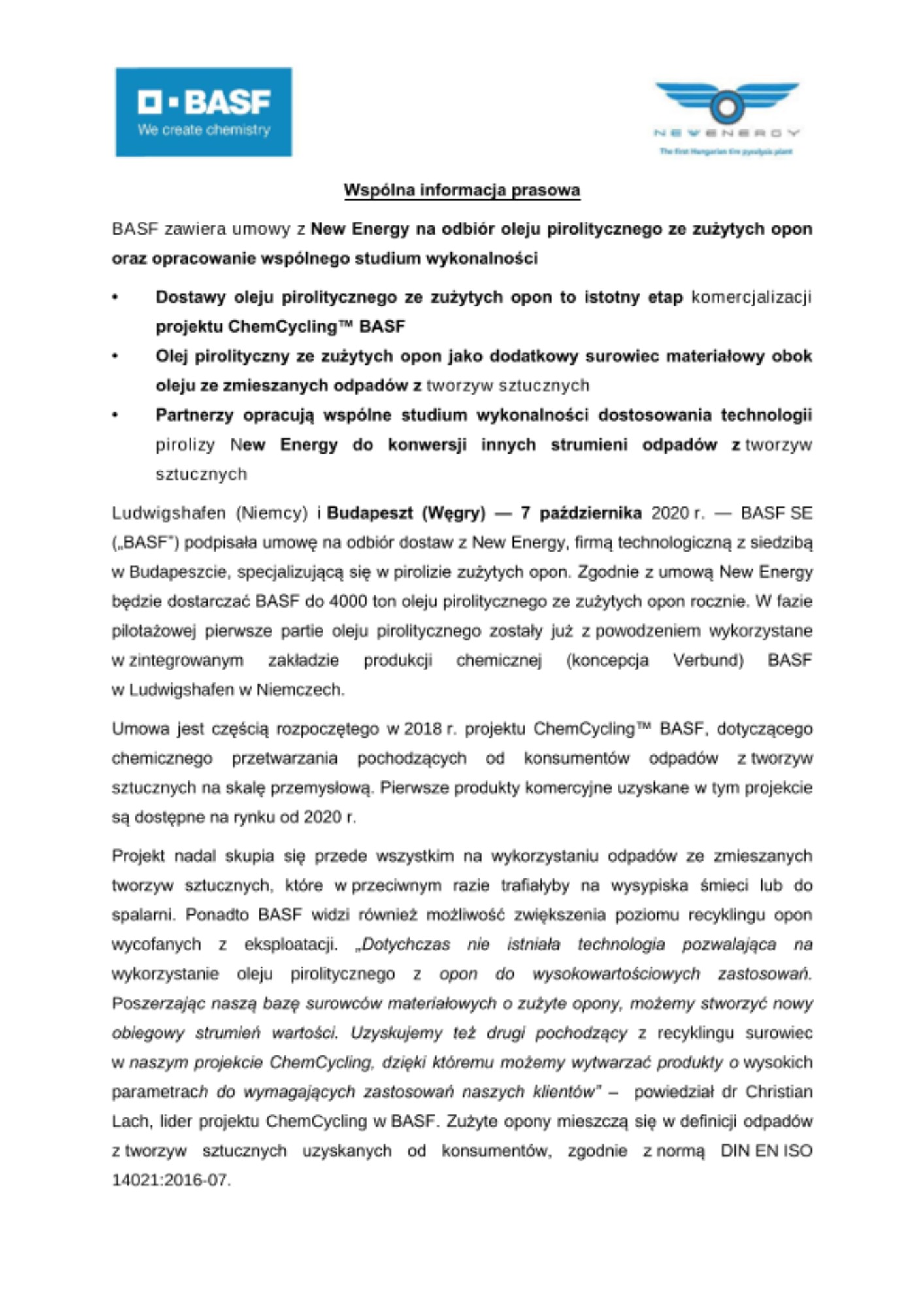 Ludwigshafen (Niemcy) i Budapeszt (Węgry) — 7 października 2020 r. — BASF SE („BASF”) podpisała umowę na odbiór dostaw z New Energy, firmą technologiczną z siedzibą w Budapeszcie, specjalizującą się w pirolizie zużytych opon. Zgodnie z umową New Energy będzie dostarczać BASF do 4000 ton oleju pirolitycznego ze zużytych opon rocznie. W fazie pilotażowej pierwsze partie oleju pirolitycznego zostały już z powodzeniem wykorzystane w zintegrowanym zakładzie produkcji chemicznej (koncepcja Verbund) BASF w Ludwigshafen w Niemczech.