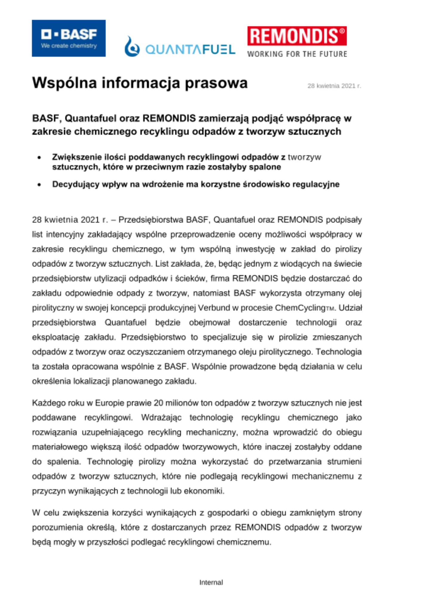 28 kwietnia 2021 r. – Przedsiębiorstwa BASF, Quantafuel oraz REMONDIS podpisały list intencyjny zakładający wspólne przeprowadzenie oceny możliwości współpracy w zakresie recyklingu chemicznego, w tym wspólną inwestycję w zakład do pirolizy odpadów z tworzyw sztucznych. List zakłada, że, będąc jednym z wiodących na świecie przedsiębiorstw utylizacji odpadków i ścieków, firma REMONDIS będzie dostarczać do zakładu odpowiednie odpady z tworzyw, natomiast BASF wykorzysta otrzymany olej pirolityczny w swojej koncepcji produkcyjnej Verbund w procesie ChemCycling™. Udział przedsiębiorstwa Quantafuel będzie obejmował dostarczenie technologii oraz eksploatację zakładu. Przedsiębiorstwo to specjalizuje się w pirolizie zmieszanych odpadów z tworzyw oraz oczyszczaniem otrzymanego oleju pirolitycznego. Technologia ta została opracowana wspólnie z BASF. Wspólnie prowadzone będą działania w celu określenia lokalizacji planowanego zakładu.