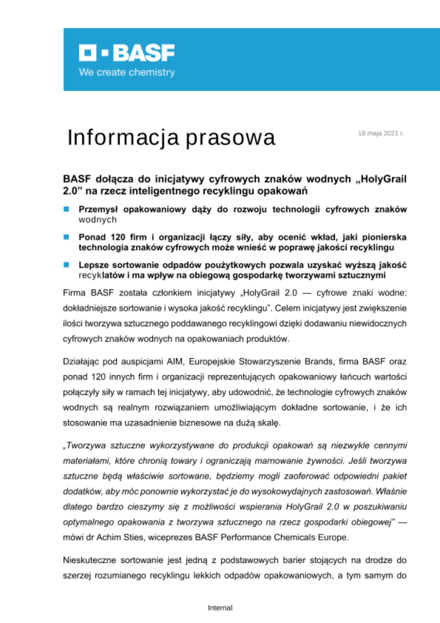 „Tworzywa sztuczne wykorzystywane do produkcji opakowań są niezwykle cennymi materiałami, które chronią towary i ograniczają marnowanie żywności. Jeśli tworzywa sztuczne będą właściwie sortowane, będziemy mogli zaoferować odpowiedni pakiet dodatków, aby móc ponownie wykorzystać je do wysokowydajnych zastosowań. Właśnie dlatego bardzo cieszymy się z możliwości wspierania HolyGrail 2.0 w poszukiwaniu optymalnego opakowania z tworzywa sztucznego na rzecz gospodarki obiegowej” — mówi dr Achim Sties, wiceprezes BASF Performance Chemicals Europe.