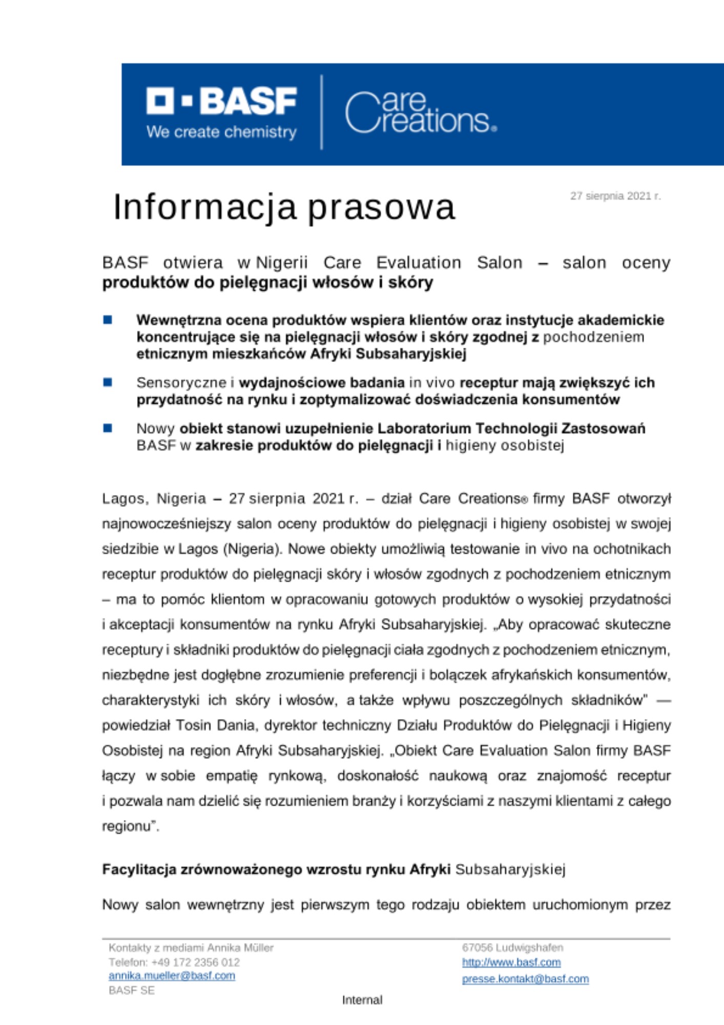 Lagos, Nigeria – 27 sierpnia 2021 r. – dział Care Creations® firmy BASF otworzył najnowocześniejszy salon oceny produktów do pielęgnacji i higieny osobistej w swojej siedzibie w Lagos (Nigeria). Nowe obiekty umożliwią testowanie in vivo na ochotnikach receptur produktów do pielęgnacji skóry i włosów zgodnych z pochodzeniem etnicznym – ma to pomóc klientom w opracowaniu gotowych produktów o wysokiej przydatności i akceptacji konsumentów na rynku Afryki Subsaharyjskiej. „Aby opracować skuteczne receptury i składniki produktów do pielęgnacji ciała zgodnych z pochodzeniem etnicznym, niezbędne jest dogłębne zrozumienie preferencji i bolączek afrykańskich konsumentów, charakterystyki ich skóry i włosów, a także wpływu poszczególnych składników” — powiedział Tosin Dania, dyrektor techniczny Działu Produktów do Pielęgnacji i Higieny Osobistej na region Afryki Subsaharyjskiej. „Obiekt Care Evaluation Salon firmy BASF łączy w sobie empatię rynkową, doskonałość naukową oraz znajomość receptur i pozwala nam dzielić się rozumieniem branży i korzyściami z naszymi klientami z całego regionu”.