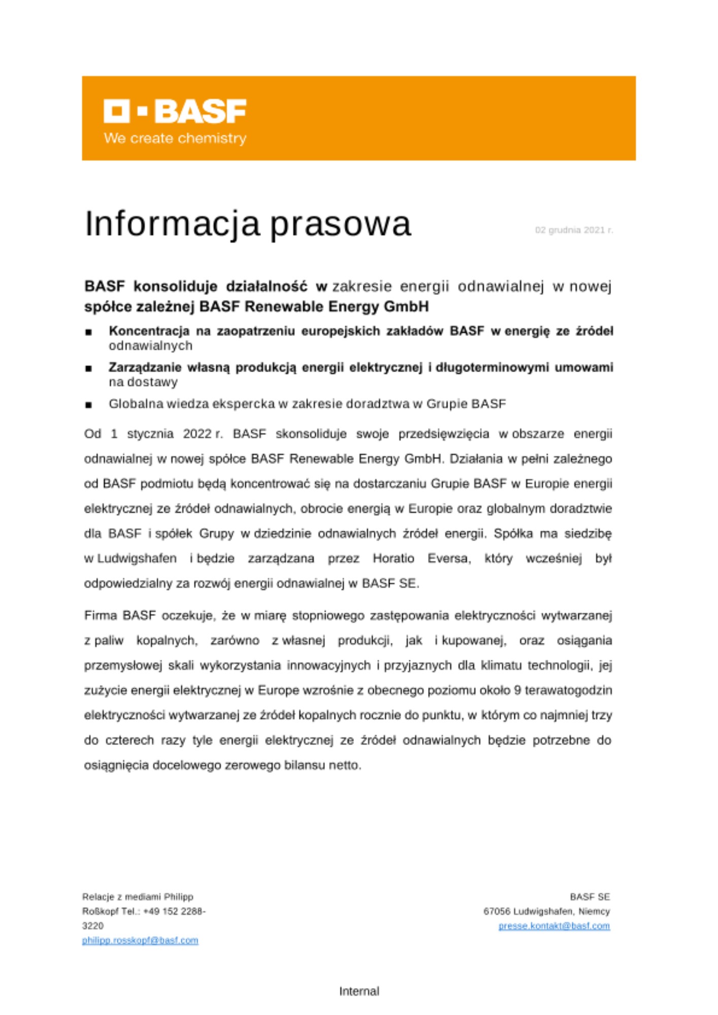 Od 1 stycznia 2022 r. BASF skonsoliduje swoje przedsięwzięcia w obszarze energii odnawialnej w nowej spółce BASF Renewable Energy GmbH. Działania w pełni zależnego od BASF podmiotu będą koncentrować się na dostarczaniu Grupie BASF w Europie energii elektrycznej ze źródeł odnawialnych, obrocie energią w Europie oraz globalnym doradztwie dla BASF i spółek Grupy w dziedzinie odnawialnych źródeł energii. Spółka ma siedzibę w Ludwigshafen i będzie zarządzana przez Horatio Eversa, który wcześniej był odpowiedzialny za rozwój energii odnawialnej w BASF SE.