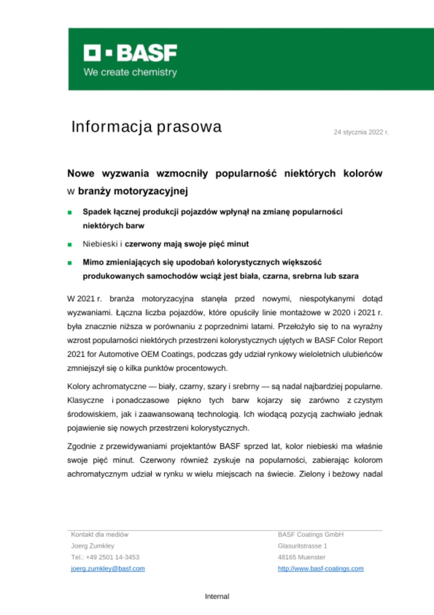 Raport BASF na temat fabrycznych kolorów w branży motoryzacyjnej (BASF Color Report for Automotive OEM Coatings) zawiera analizę zgromadzonych przez dział BASF Coatings danych dotyczących globalnej produkcji samochodów i stosowania lakierów w pojazdach lekkich w 2021 r.
