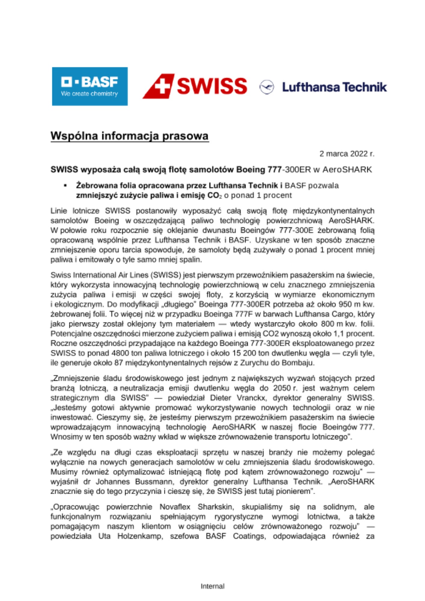 Linie lotnicze SWISS postanowiły wyposażyć całą swoją flotę międzykontynentalnych samolotów Boeing w oszczędzającą paliwo technologię powierzchniową AeroSHARK. W połowie roku rozpocznie się oklejanie dwunastu Boeingów 777-300E żebrowaną folią opracowaną wspólnie przez Lufthansa Technik i BASF. Uzyskane w ten sposób znaczne zmniejszenie oporu tarcia spowoduje, że samoloty będą zużywały o ponad 1 procent mniej paliwa i emitowały o tyle samo mniej spalin.