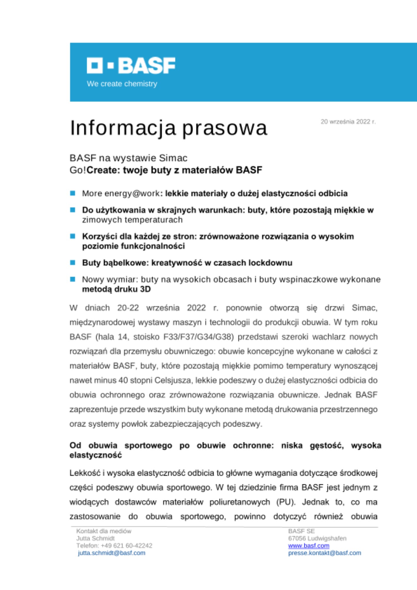 W dniach 20-22 września 2022 r. ponownie otworzą się drzwi Simac, międzynarodowej wystawy maszyn i technologii do produkcji obuwia. W tym roku BASF (hala 14, stoisko F33/F37/G34/G38) przedstawi szeroki wachlarz nowych rozwiązań dla przemysłu obuwniczego: obuwie koncepcyjne wykonane w całości z materiałów BASF, buty, które pozostają miękkie pomimo temperatury wynoszącej nawet minus 40 stopni Celsjusza, lekkie podeszwy o dużej elastyczności odbicia do obuwia ochronnego oraz zrównoważone rozwiązania obuwnicze. Jednak BASF zaprezentuje przede wszystkim buty wykonane metodą drukowania przestrzennego oraz systemy powłok zabezpieczających podeszwy.