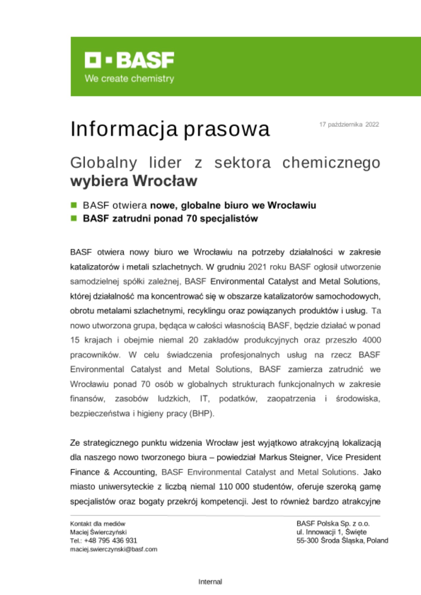 Ze strategicznego punktu widzenia Wrocław jest wyjątkowo atrakcyjną lokalizacją dla naszego nowo tworzonego biura – powiedział Markus Steigner, Vice President Finance & Accounting, BASF Environmental Catalyst and Metal Solutions. Jako miasto uniwersyteckie z liczbą niemal 110 000 studentów, oferuje szeroką gamę specjalistów oraz bogaty przekrój kompetencji. Jest to również bardzo atrakcyjne otoczenie biznesowe, w którym obecnych jest wiele globalnych firm z branży technologicznej, produkcyjnej, konsultingowej, motoryzacyjnej czy energetycznej. Także pod względem geograficznym wybór Wrocławia jest nieprzypadkowy. Miasto znajduje się bowiem w środkowej strefie czasowej w stosunku do naszych lokalizacji biznesowych na świecie co czyni go optymalnym wyborem.