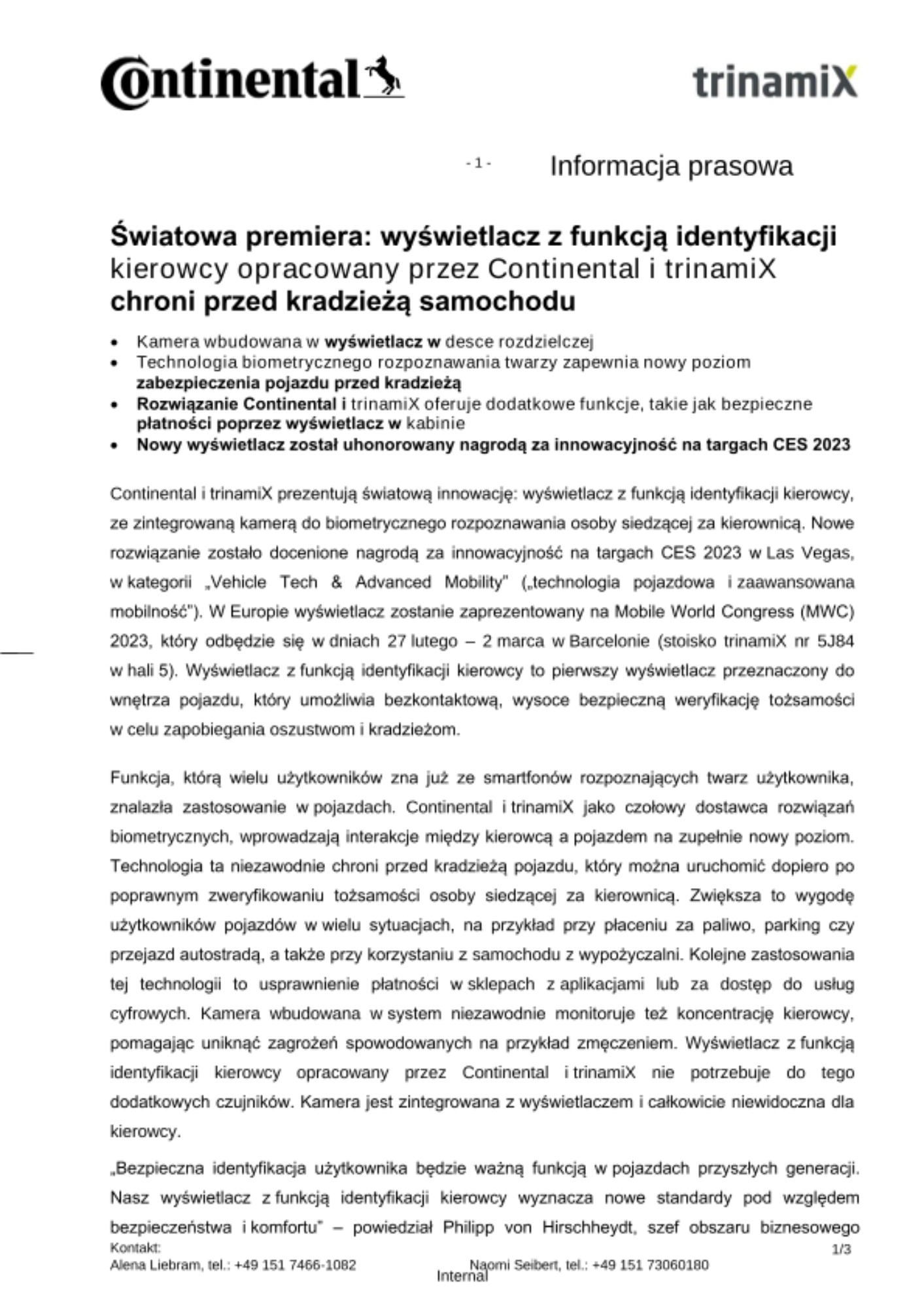 Continental i trinamiX prezentują światową innowację: wyświetlacz z funkcją identyfikacji kierowcy, ze zintegrowaną kamerą do biometrycznego rozpoznawania osoby siedzącej za kierownicą. Nowe rozwiązanie zostało docenione nagrodą za innowacyjność na targach CES 2023 w Las Vegas, w kategorii „Vehicle Tech & Advanced Mobility” („technologia pojazdowa i zaawansowana mobilność”). W Europie wyświetlacz zostanie zaprezentowany na Mobile World Congress (MWC) 2023, który odbędzie się w dniach 27 lutego – 2 marca w Barcelonie (stoisko trinamiX nr 5J84 w hali 5). Wyświetlacz z funkcją identyfikacji kierowcy to pierwszy wyświetlacz przeznaczony do wnętrza pojazdu, który umożliwia bezkontaktową, wysoce bezpieczną weryfikację tożsamości w celu zapobiegania oszustwom i kradzieżom.