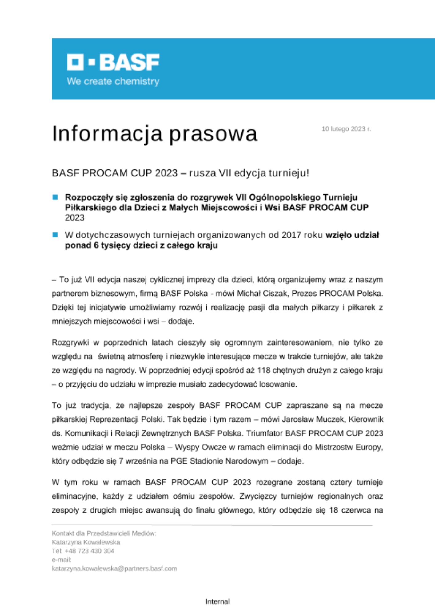 - Rozpoczęły się zgłoszenia do rozgrywek VII Ogólnopolskiego Turnieju Piłkarskiego dla Dzieci z Małych Miejscowości i Wsi BASF PROCAM CUP 2023