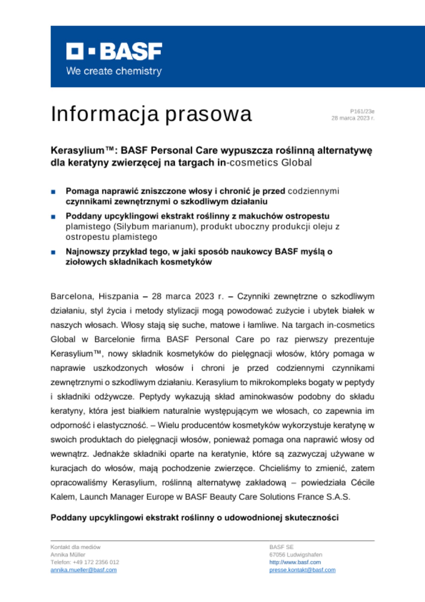 Barcelona, Hiszpania – 28 marca 2023 r. – Czynniki zewnętrzne o szkodliwym działaniu, styl życia i metody stylizacji mogą powodować zużycie i ubytek białek w naszych włosach. Włosy stają się suche, matowe i łamliwe. Na targach in-cosmetics Global w Barcelonie firma BASF Personal Care po raz pierwszy prezentuje Kerasylium™, nowy składnik kosmetyków do pielęgnacji włosów, który pomaga w naprawie uszkodzonych włosów i chroni je przed codziennymi czynnikami zewnętrznymi o szkodliwym działaniu. Kerasylium to mikrokompleks bogaty w peptydy i składniki odżywcze. Peptydy wykazują skład aminokwasów podobny do składu keratyny, która jest białkiem naturalnie występującym we włosach, co zapewnia im odporność i elastyczność. – Wielu producentów kosmetyków wykorzystuje keratynę w swoich produktach do pielęgnacji włosów, ponieważ pomaga ona naprawić włosy od wewnątrz. Jednakże składniki oparte na keratynie, które są zazwyczaj używane w kuracjach do włosów, mają pochodzenie zwierzęce. Chcieliśmy to zmienić, zatem opracowaliśmy Kerasylium, roślinną alternatywę zakładową – powiedziała Cécile Kalem, Launch Manager Europe w BASF Beauty Care Solutions France S.A.S.
